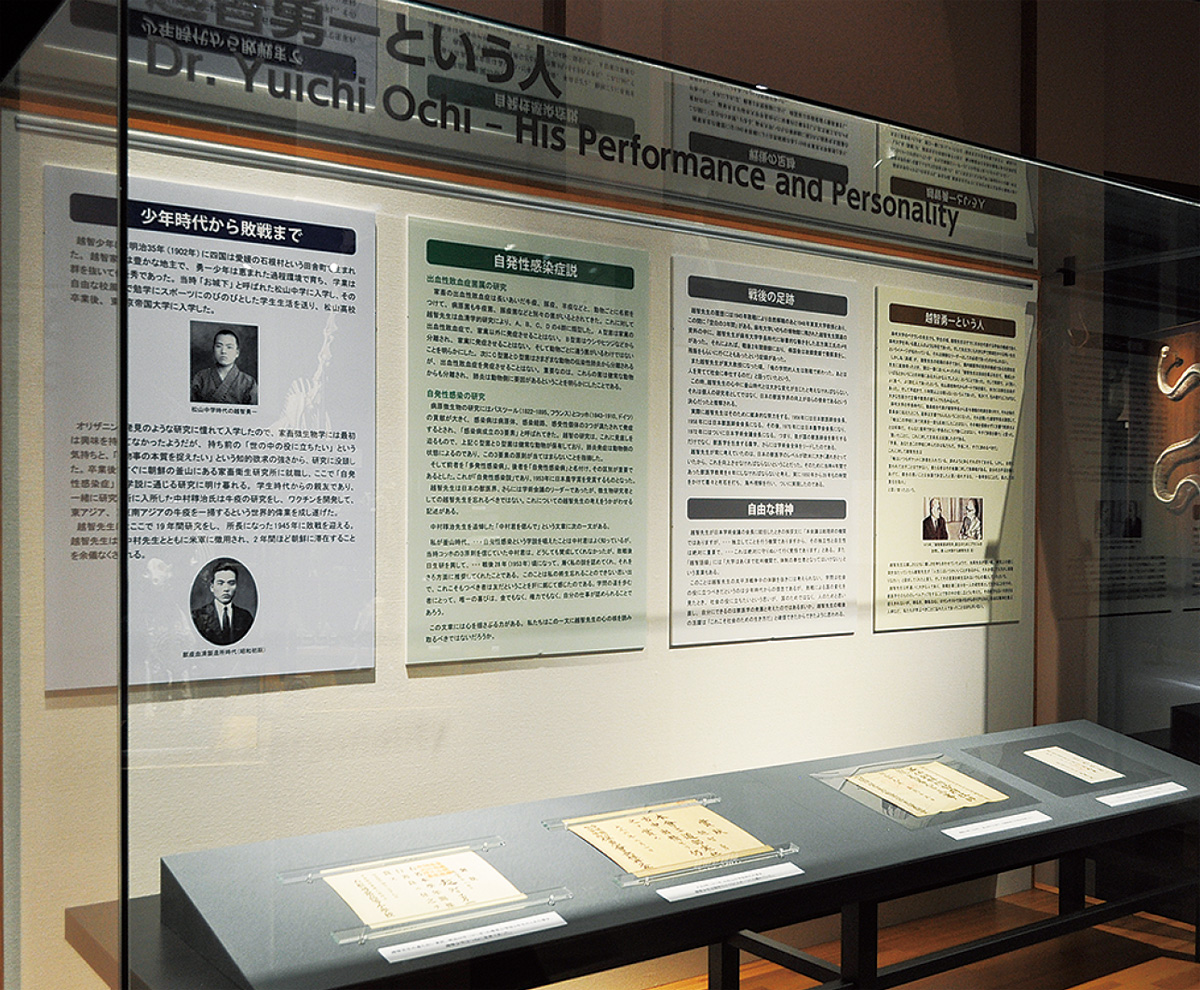 今回の企画展では、同大学の名誉学長・越智勇一氏を題材に、同館では初めて一人の人物に焦点を当てた展示を実施。研究者としては家畜の感染症研究に没頭し「自発性感染症」という学説を提唱し、日本学術会議会長などを務めた同氏の業績を紹介。加えて、同氏の飛びぬけた行動力など人物的魅力にも注目した展示が行われている。