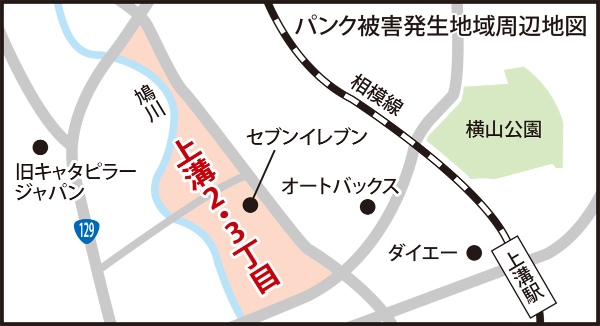 上溝2・3丁目を中心に今年5月から自家用車などを中心にタイヤのパンク被害が続いており、相模原署によると10月5日時点で被害台数は100台を超えている。9月24日には一夜にして60台以上の車が被害に遭い、周辺住民は不安を募らせている。犯人は逮捕されておらず、同署では周辺のパトロールを強化するなど警戒を強めている。
