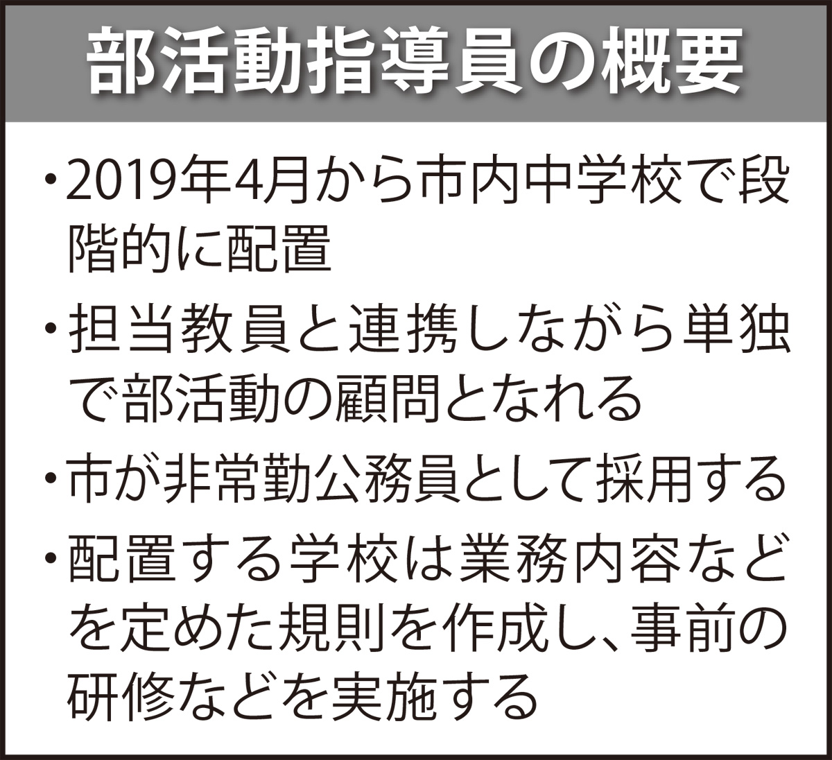 指導員は国が17年4月施行した改正学校教育法施行規則に位置付けられ、市が非常勤公務員として雇用し単独で部活動の顧問となれることが特徴。これまでも外部指導者が部活動を支援する仕組みはあったが、あくまで顧問は教員だった。今回の決定で、指導員は担当教員と連携を取りながら顧問を務め、土日に行われる大会への引率も単独で可能となるため、市教委では教員の勤務時間短縮に効果的と見ている。指導員は元教員などを想定しており、市教委は来年度に配置される学校数については「募集状況などを見て判断する」としている。