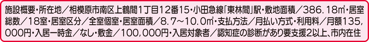 施設は全て個室で18室。エアコン、照明、緊急ブザーが付く同施設。入居金0円で敷金10万円(退室時精算)。月額料金は13万5千円(家賃・食事・水光・管理費込)。「低料金で高サービス」を掲げ、相模原、座間、横浜などで施設を14カ所展開する(株)エクシオジャパンの市内4カ所目のグループホーム。実績を生かし、介護はもちろん提携医療機関による訪問医療などサポートも万全だ。