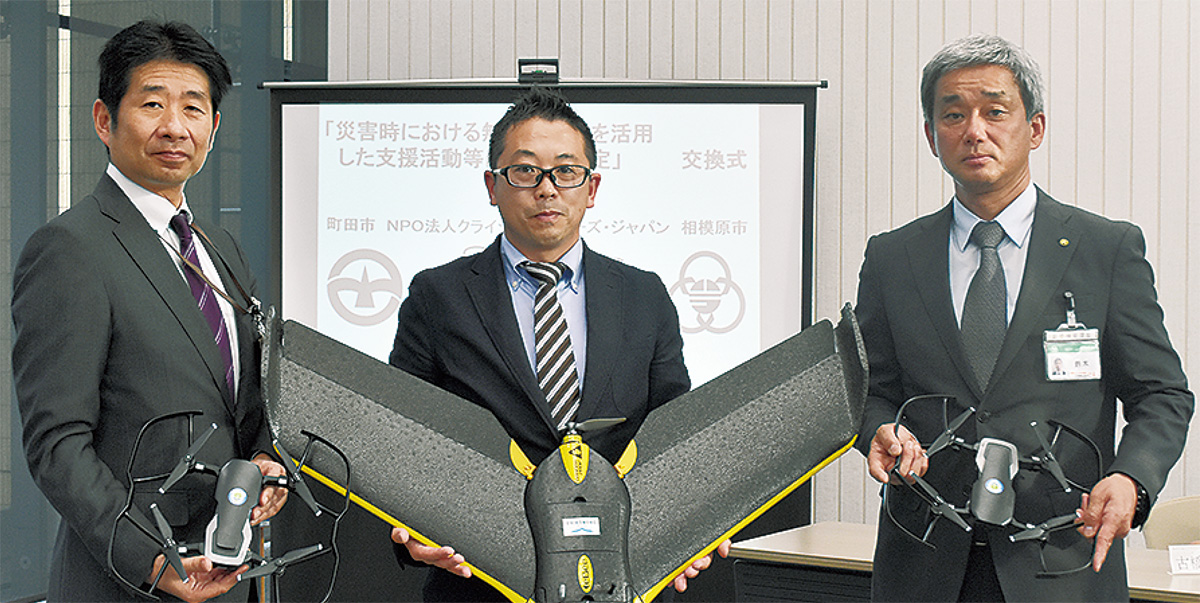 同法人では災害時のドローンを活用した支援事業のほか、地図作成や災害訓練などの活動を行っている。一方、同協定は境川での氾濫や土砂崩れなどの災害も想定しており、今回、広域にわたる災害対応を円滑に実施するため境川を挟んで隣接する町田市と合同で締結する運びとなった。
