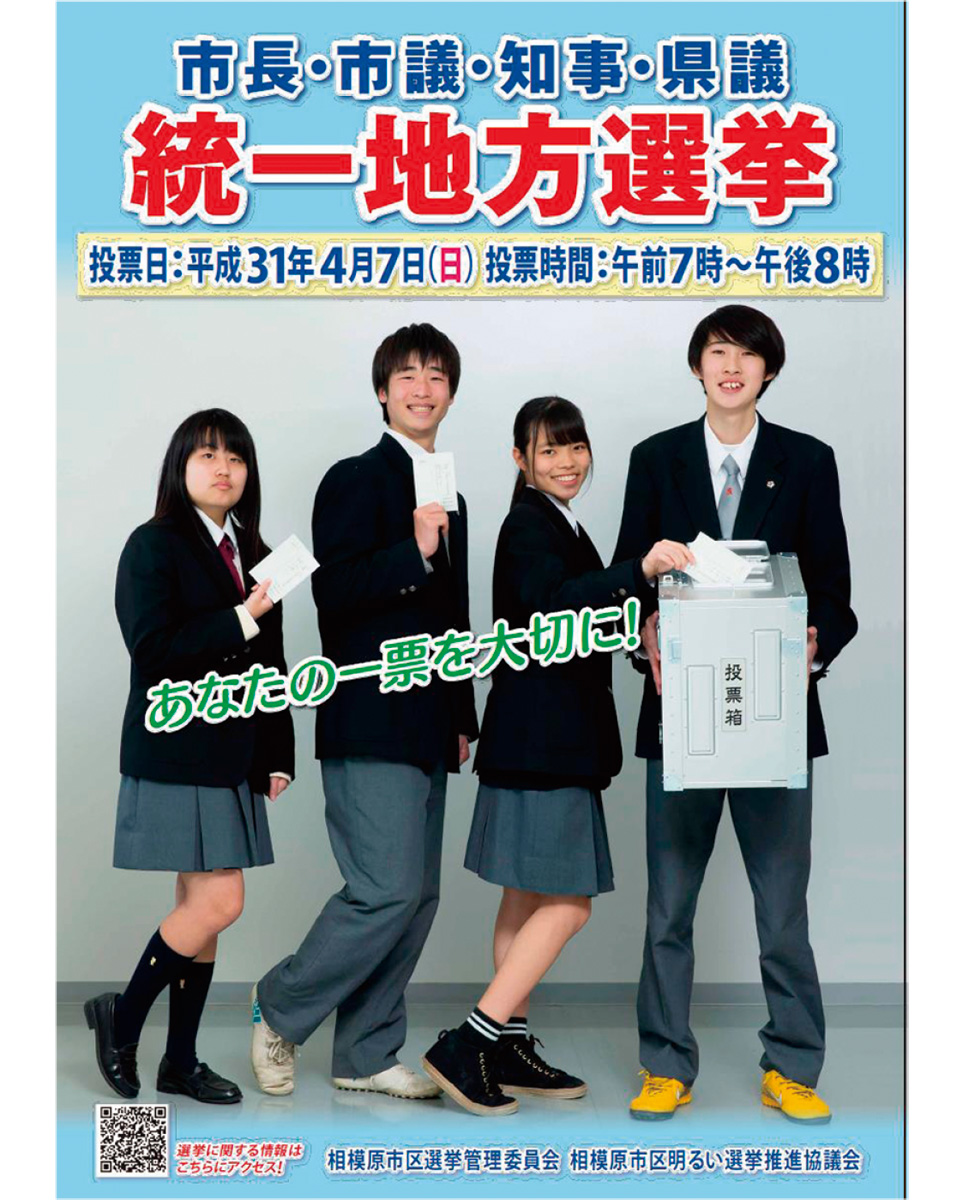 市選挙管理委員会(選管)では、市内の県立高校生を登場させた投票啓発用ポスターを作成し配布。市内の駅や大型店舗、公共施設などに掲示を呼びかけている。
