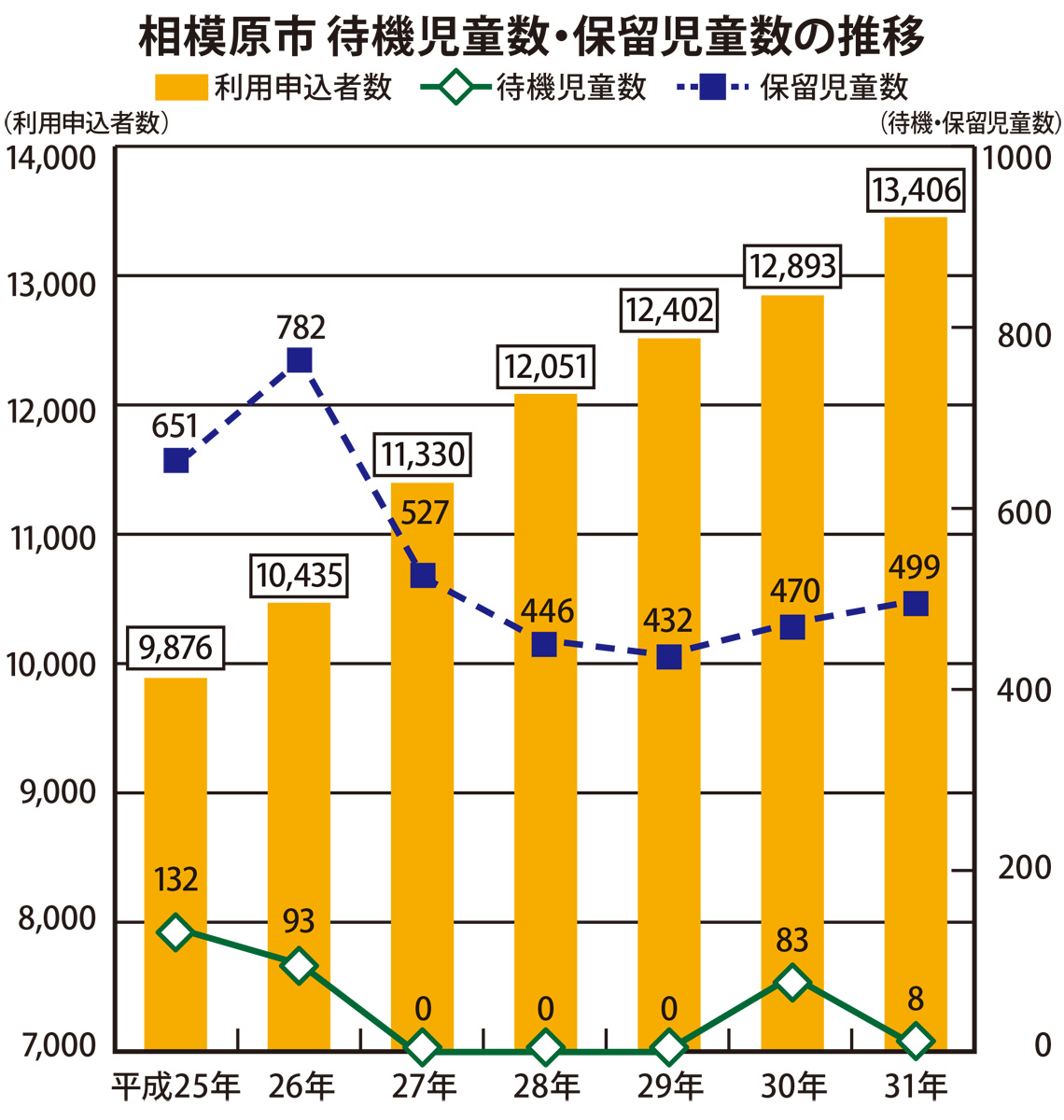 就学前児童数は前年より約1000人減少したものの、保育需要の高まりから利用申込者数は13406人(前年比513人増)に上り、過去最多となった。待機児童数は大幅減となった一方で、特定の保育所への入所を希望する場合や、保護者が産休・育休中の場合のいわゆる「保留児童」(隠れ待機児童)は前年比29人増の499人だった。