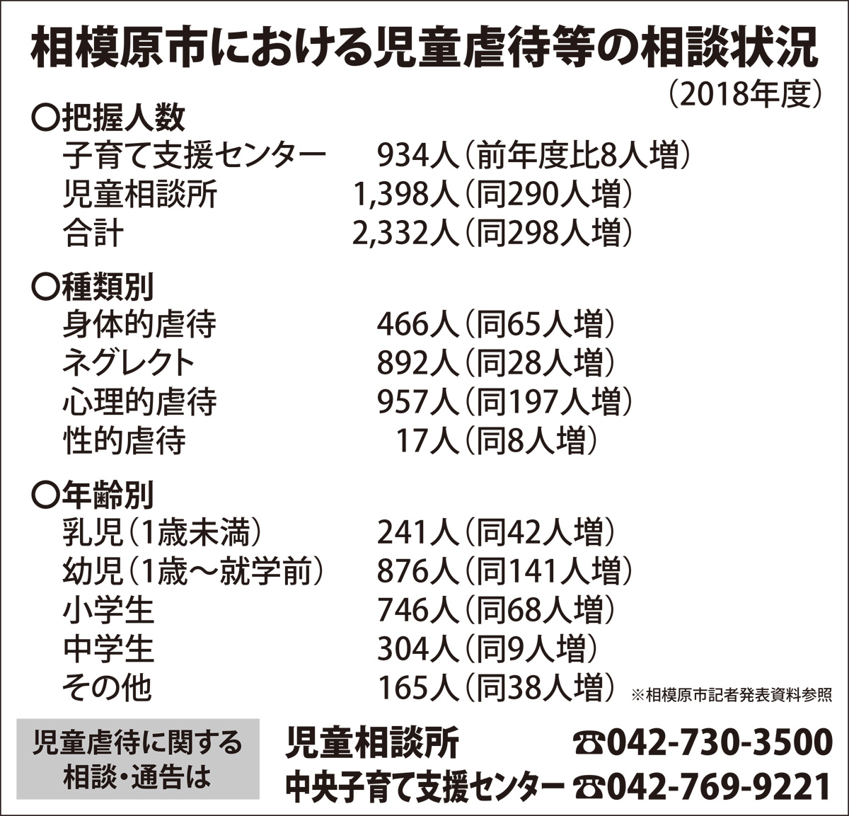 市が18年度中に把握した虐待が疑われる児童の数は2332人で、前年度に比べ298人増加した。最も多い虐待は脅迫、無視など心的外傷を与える言動を行う「心理的虐待」で、957件(前年度比197件増)に上り全体の41%を占めた。次いで、食事を与えない、長時間放置などの育児放棄を意味する「ネグレクト」で892件(同28件増)。殴る、蹴るなどの「身体的虐待」が466件(同65件増)だった。
