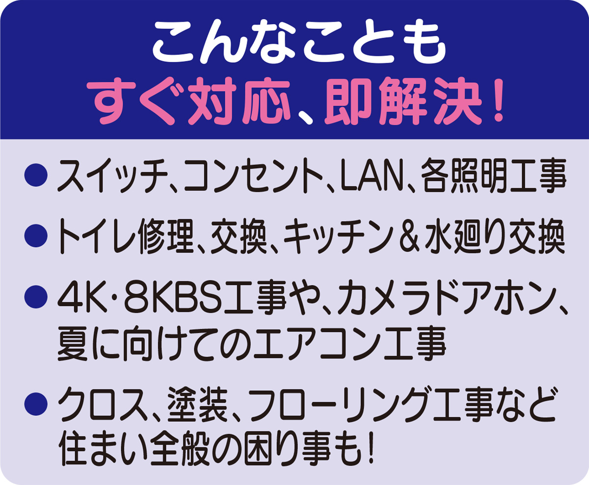 同店は「テレビが映らない」「照明がつかない」といった電気のトラブルはもとより、水廻り、リフォームなど住まい全般の困り事も気軽に受け付け。夏を前に、エアコン工事も好評。同店ではガス漏れにつながらないような配管を使用するなど安全安心で丁寧な仕事にこだわり、工事も条件が整えば即日可能。素早さ、確実さ、丁寧さが人気の秘密だ。生活の「困った」なら気軽に相談を。