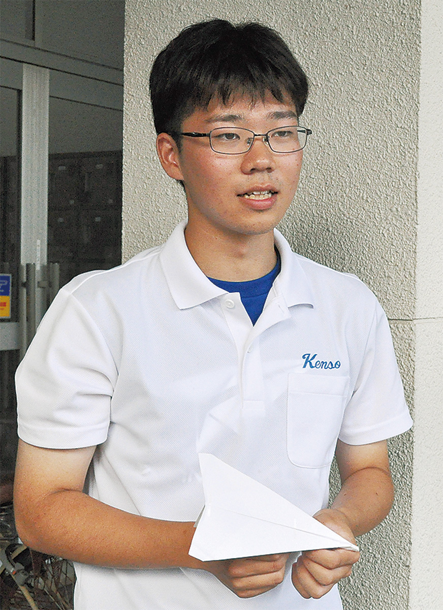 伊藤さんは小学生の時、小惑星探査機「はやぶさ」帰還のニュースを目にして以来、ロケットや航空機の虜に。高校では「県相紙飛行機研究会」を結成しており、飛距離を伸ばすため日々試行錯誤を重ねている。今回の結果に伊藤さんは、「実現したかっただけに悔しいが、自分の取り組んでいることが社会問題に応用できる可能性を知ることができた」と話した。