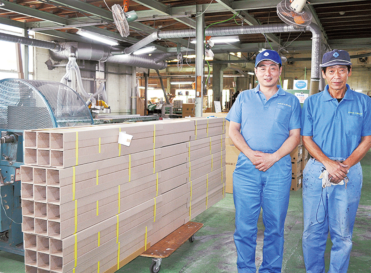 製造の2本柱は「紙」と「化成品」。輸送時の衝撃から製品を保護する紙製の筒(紙管)や容器などを製造しており、梱包の際の緩衝材として活用されている。紙を加工し積層するため、角紙管の縦からの強度は500kg。かつてはエアコンの室外機などの輸送に重宝されたという。