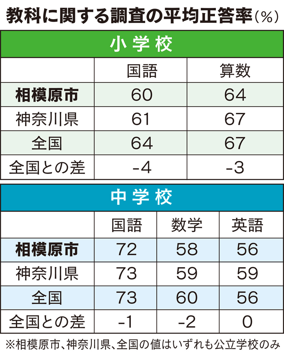 子どもの学力状況を把握するために年に一度行われている「全国学力・学習状況調査」の結果がこのほど公表された。相模原市は、すべての項目において、全国平均正答率と同程度もしくは低い状況にあることが明らかになった。