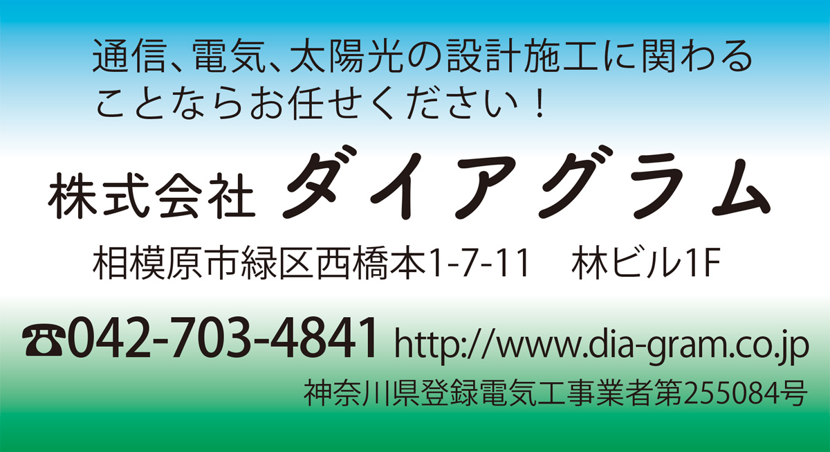 戸建やアパート、工場、店舗の電気工事や太陽光設置を設計から行い、通信部門では光ファイバーやLAN、集合住宅のテレビも施工。電気・通信工事全般のプロフェッショナルだ。受けた仕事はすべて自社で手がける。「電気も通信もできるので仕事のロスなく価格も抑えた提案ができる」。休日は自己申告制。働きやすさも自負するところ。「再利用できるものはする」「ゴミはなるべく出さない」「排気ガスを抑える」は社内ですでに浸透。「より良い世の中へ」。ダイアグラムの挑戦は続く。