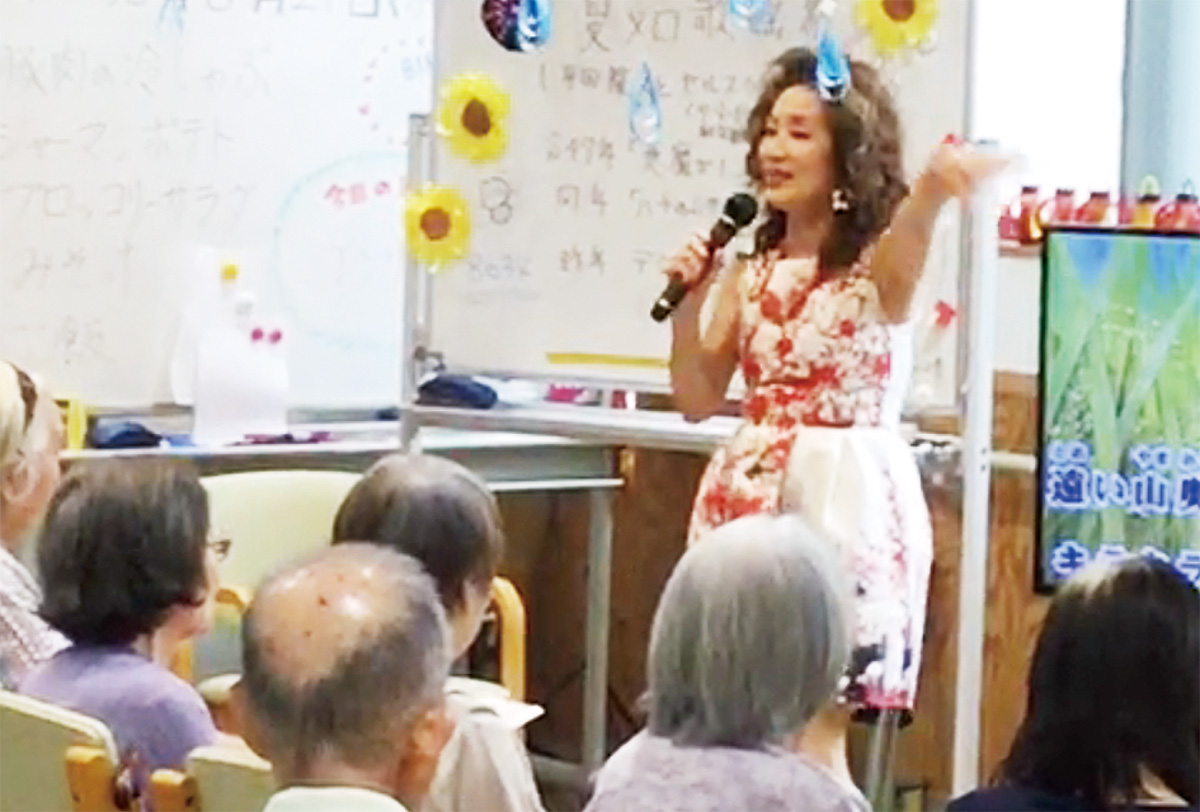 「えっー、本物?」「“ハチのムサシは死んだのさ”の歌手?」などの驚きとともにそのボーカリスト村部レミさんと一緒に懐メロを10曲ほど歌ったのは、エクシオジャパン関連のデイサービスの利用者。レクの時間にボランティア参加してもらった。
