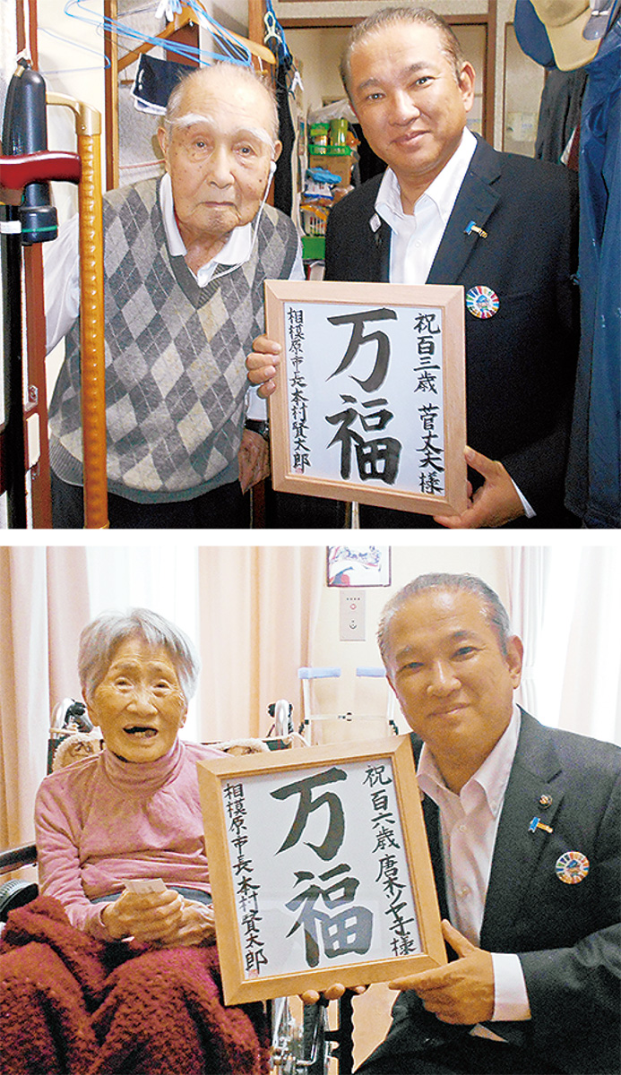 相模原市の敬老事業として5日、本村賢太郎市長が100歳を越える高齢者を訪問し、健康と長寿をお祝いした。