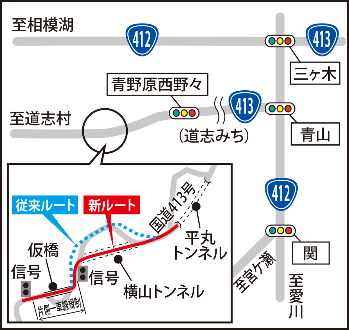 国道413号は、昨年10月の台風により発生した斜面の崩落のため、青根地区で通行止めとなっていた。横山トンネルの山梨県側の道路に長さ約50mの仮橋をかけて、信号機による片側相互通行とすることで今年4月19日に暫定開通したものの、まだ復旧工事は行われており、依然として不便な状況が続いている。地区全体の災害復旧工事が終了し、全面開通となるのは来年3月末の見込み。