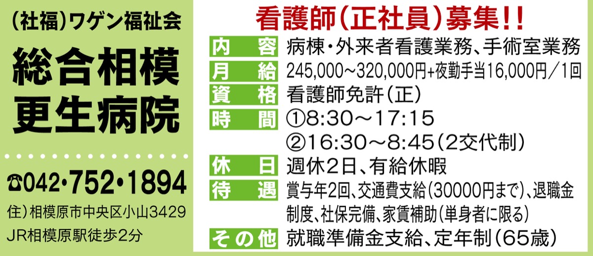 総合相模更生病院では病院機能の強化に伴い、看護師を募集している。