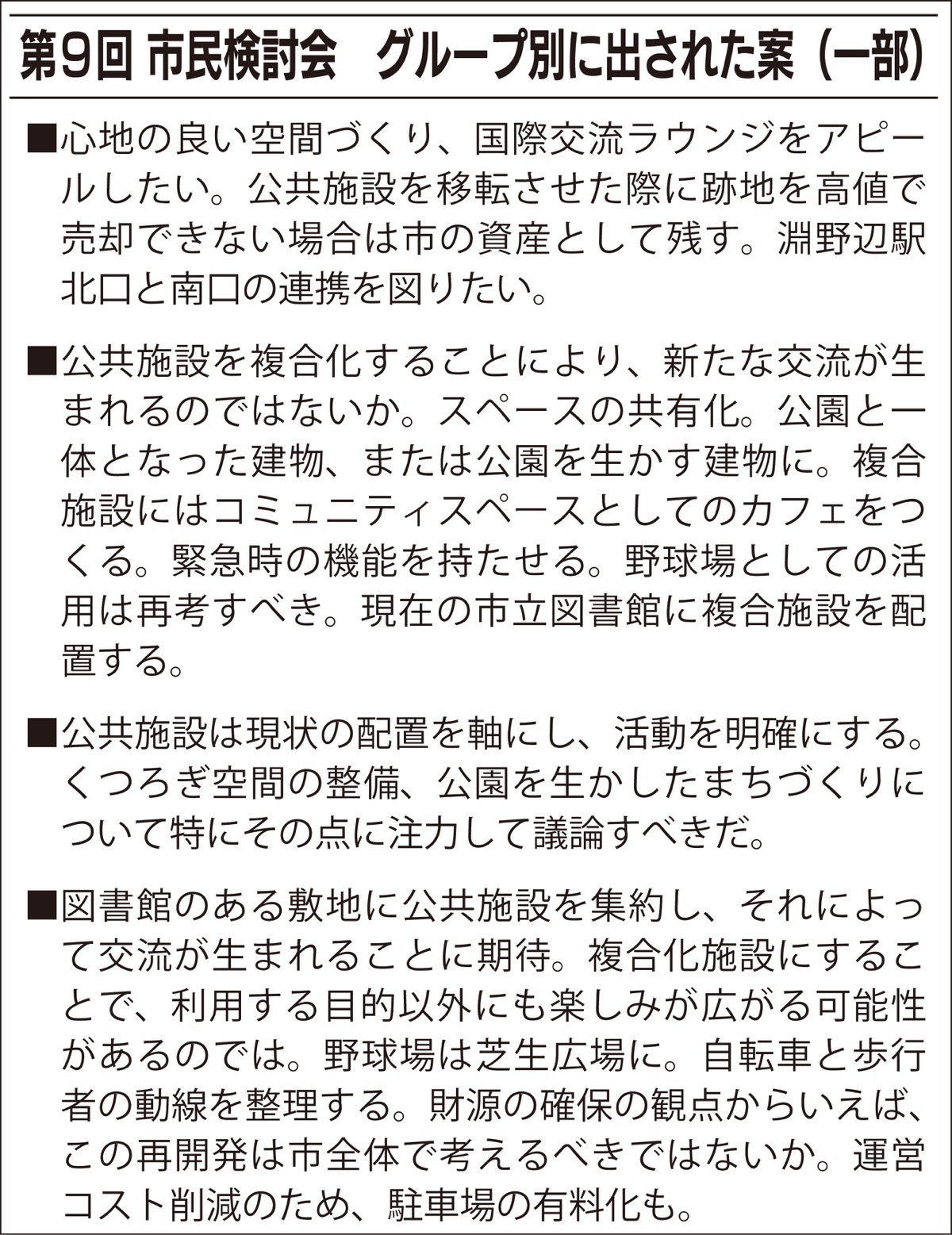 時間の都合でグループの発表の場は短縮されたものの、中には複合施設の新設による交流の深化に言及する案や、現状の配置を軸に公共施設の機能の活性化を追求した案などが示された。次回は各案について継続して議論を行うほか、事業の実施にかかる費用や建築物の内容も含めて実現可能性を探る見通し。次回は2月29日(土)に市役所本庁舎で開催される。