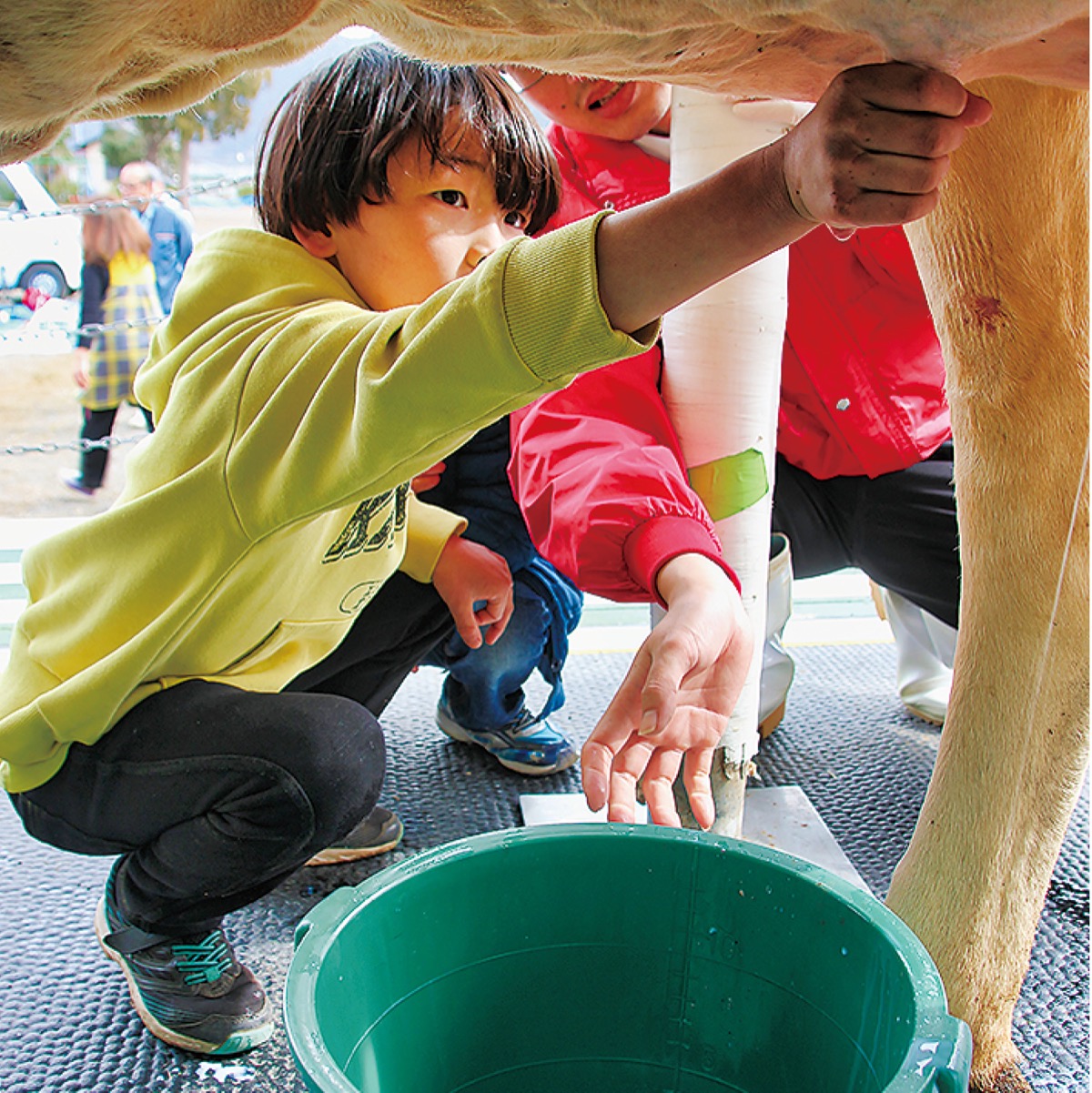 そして、搾乳のコツについて講義を受けた児童らは、ついに乳搾りに挑戦。一人ずつ搾乳体験車に上がってしゃがみ込み、およそ600kgのホルスタイン牛の乳を上から下へと絞ると、勢いよく生乳が噴き出てきた。