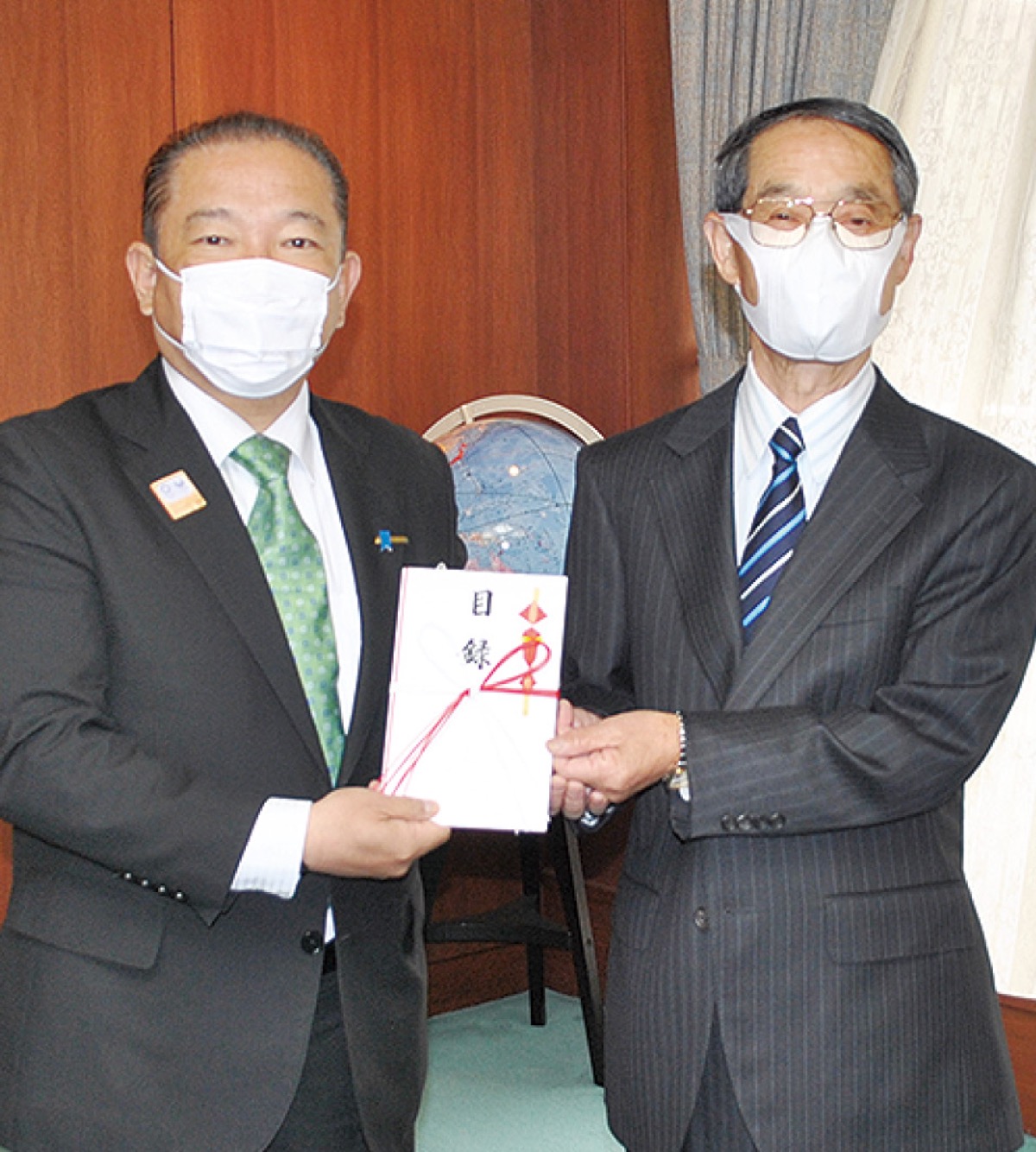 市が市内医療従事者に対する医療用マスク、ガウンなどの提供や医療設備を充実するために創設した「新型コロナウイルス感染症対策支援寄附金」に対し4月27日、アルプス技研の創業者で、同社の最高顧問を務める松井利夫氏と櫻内工務店は、本村賢太郎市長を訪問し、寄付を行った。