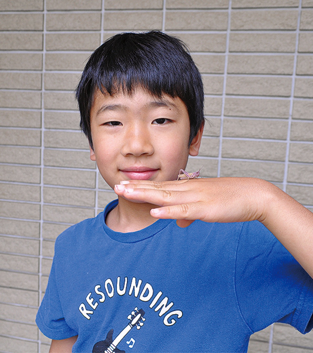 市立桜台小学校(南区)に通う池田朔(さく)君(2年)が5月13日、横浜水道道緑道でピンク色のバッタを捕まえた。通常茶色や緑色に変わるバッタの色彩変異と思われるもので、長年市立博物館に勤めた職員でも見ることは珍しいという。