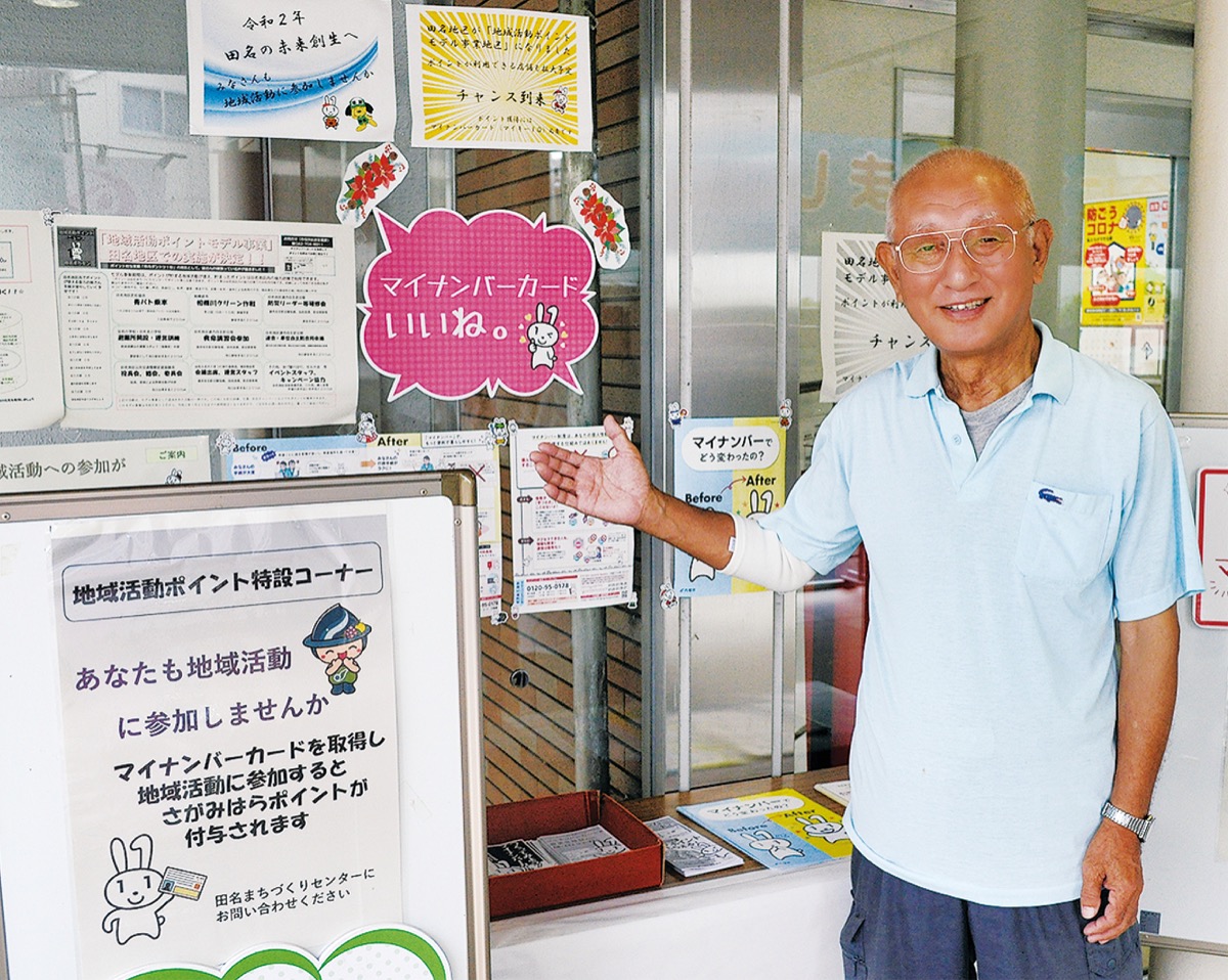 それでも「この地域を盛り上げたい」「新たな担い手の地域デビューのきっかけにしたい」と一念発起。志村会長ら地元の有志7人がマイナンバーカードの申請を行い、同事業の仕組みや利用方法を身をもって示すことからスタート。同センター職員と実際にポイント付与が可能な交通安全運動や防犯活動に出向いては、制度の説明などの広報活動に注力した。「最初は地域の人も関心を寄せなかったが、段々と人が集まってきた」と次第に手応えを感じるようになった志村会長。19年2月に同センターで行われたマイナンバーカード申請補助説明会を経て、ポイント付与人数が田名地区だけで100人近くに及び、その成果が反映される形となった。
