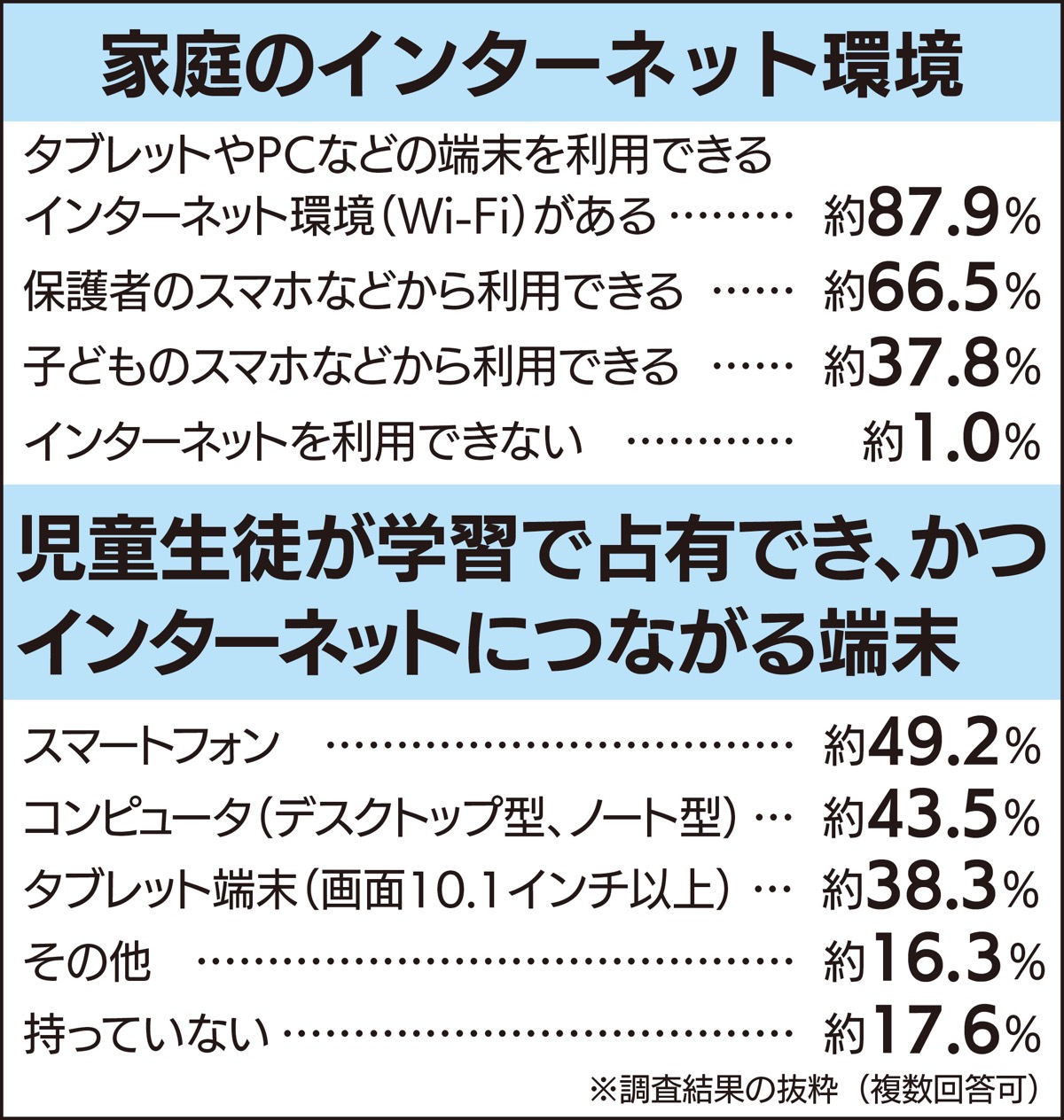 一方で、通信環境設備がなく「インターネットを利用できない」と回答したのは約1・0%(399家庭、児童生徒総数で換算すると536人)だった。また、約66・5%が「保護者のスマホなどからインターネットを利用できる」と回答したことから、親の不在時に通信環境が整わない可能性もあるため、モバイルルータなどの貸与の必要性が浮かび上がった。