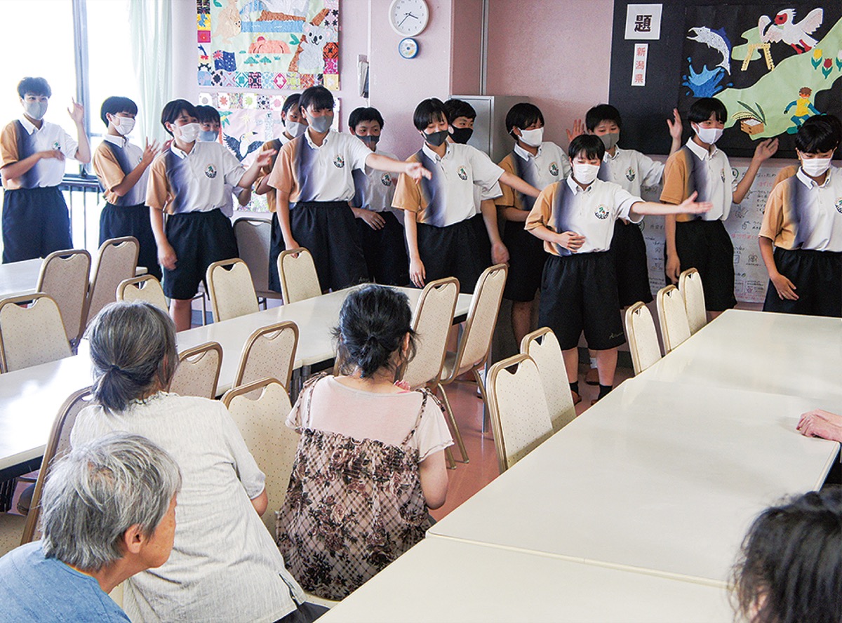 「コロナ禍なので、施設に入るのは無理だろうと思った。だから最初は施設の周りを掃除して帰ろうと思っていた」と松岡部長。だが施設側は感染防止対策を講じつつ、中に招き入れてくれた。とっさのことで何をしようかと考えた末、9月24日の体育祭で3年全員で踊るために練習していたダンスを披露することに。携帯電話から音楽を流し、施設に借りたスピーカーへ無線でつないだ。1、2年生は手拍子などで場を盛り立てた。そして最後に全員で校歌を歌唱。施設職員や利用者は手拍子で応え、部員にも笑みが溢れた。「利用者さんが『お礼を言いたい』と何人も手を挙げて『ありがとう』と言ってくれた。私たちもうれしかった。楽しんでもらえたと思う」と笑顔で振り返る松岡部長。黒川教諭は「この学校は地域から愛されていると感じる。今回はそれをお返ししたくて学校全体がお礼を言いたかった。彼女たちがまず最初に言ってくれた」と目を細めた。赤間理事長は生徒の行動に「若い学生がこうして施設に来てくれたのはうれしい。地域の方に気持ちよく生活していただきたいと行っている取り組みに成果があったことは私たちとしてもよかった。引き続き法人各施設で地域貢献に努めていきたいと実感した」と話した。