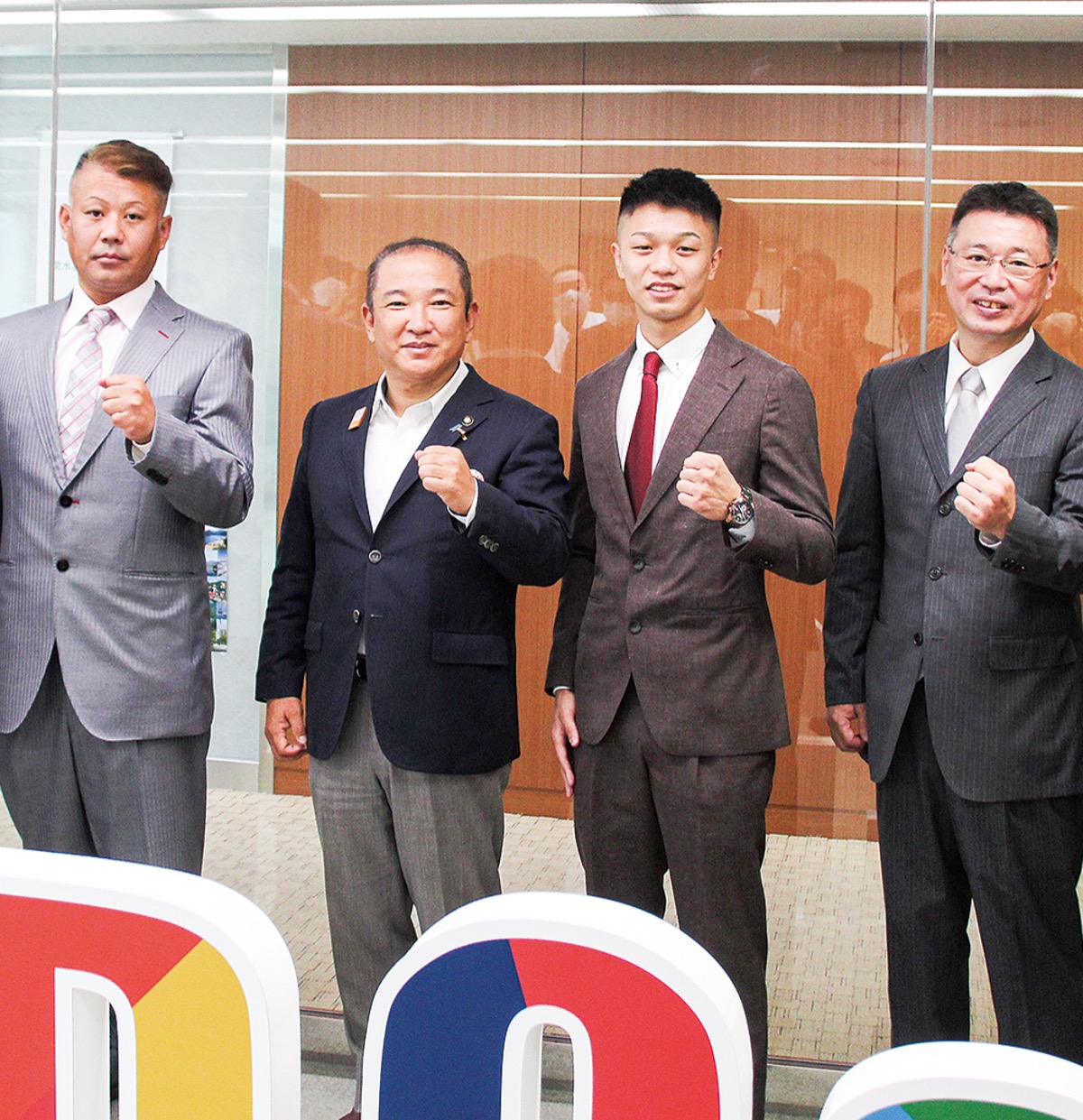 本村市長は「コンディションをつくるのは大変だと思うが相手も同じ。負けないように最高のパフォーマンスを期待している」と応じ、「中谷さんに世界タイトルを取っていただければ市民への大きなプレゼントになり子どもたちの励みにもなる。市も応援している」と中谷選手を激励した。