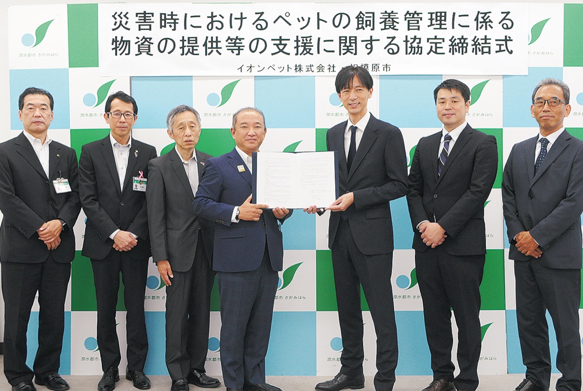 災害時に避難所などでペットを飼養管理する際に必要となる物資を提供することを目的とした協定が1日、市とイオンペット(米津一郎社長)との間で締結された。