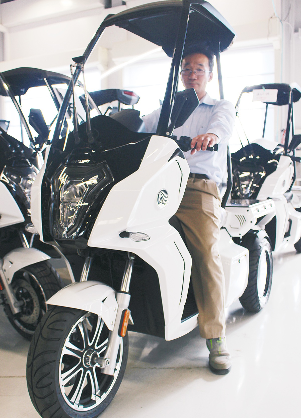 エコな電動バイクを広めるため、より活用される「仕事用」に特化し、こだわったのがデザイン。製造するすべてのバイクをデザイン力に定評のあるイタリアのデザイナーに依頼し、「これまでにないものを」という構想の中、生まれたのが相模原工場に並ぶ3輪電動スクーターなのだという。