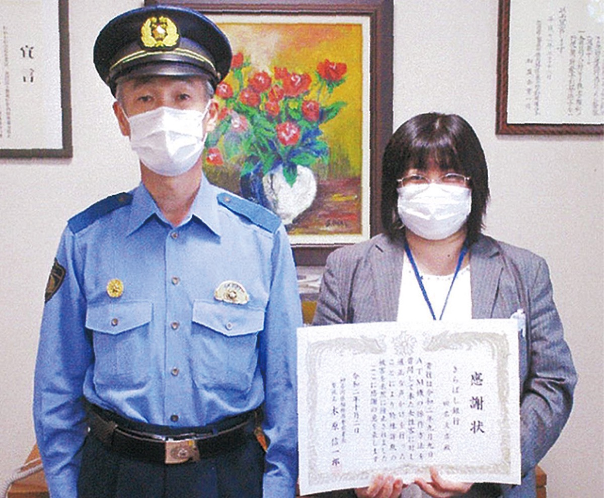 振り込め詐欺の被害を未然に防いだ、きらぼし銀行田名支店の白井小百合さんに2日、相模原警察署(木原信一郎署長)から感謝状が贈られた。