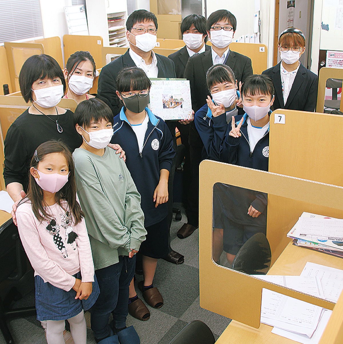 段ボール・紙器・梱包材製造販売などを行う東鈴紙器(小町通)が9月中旬、学習塾「スクールIE南橋本校」(清新)に、飛沫対策用パーテーション(間仕切り)を寄贈した。そのことを受けて、同塾に通う子どもたちが10月7日、同社の鈴木和弥社長に対して返礼の寄せ書きと菓子をプレゼントした。