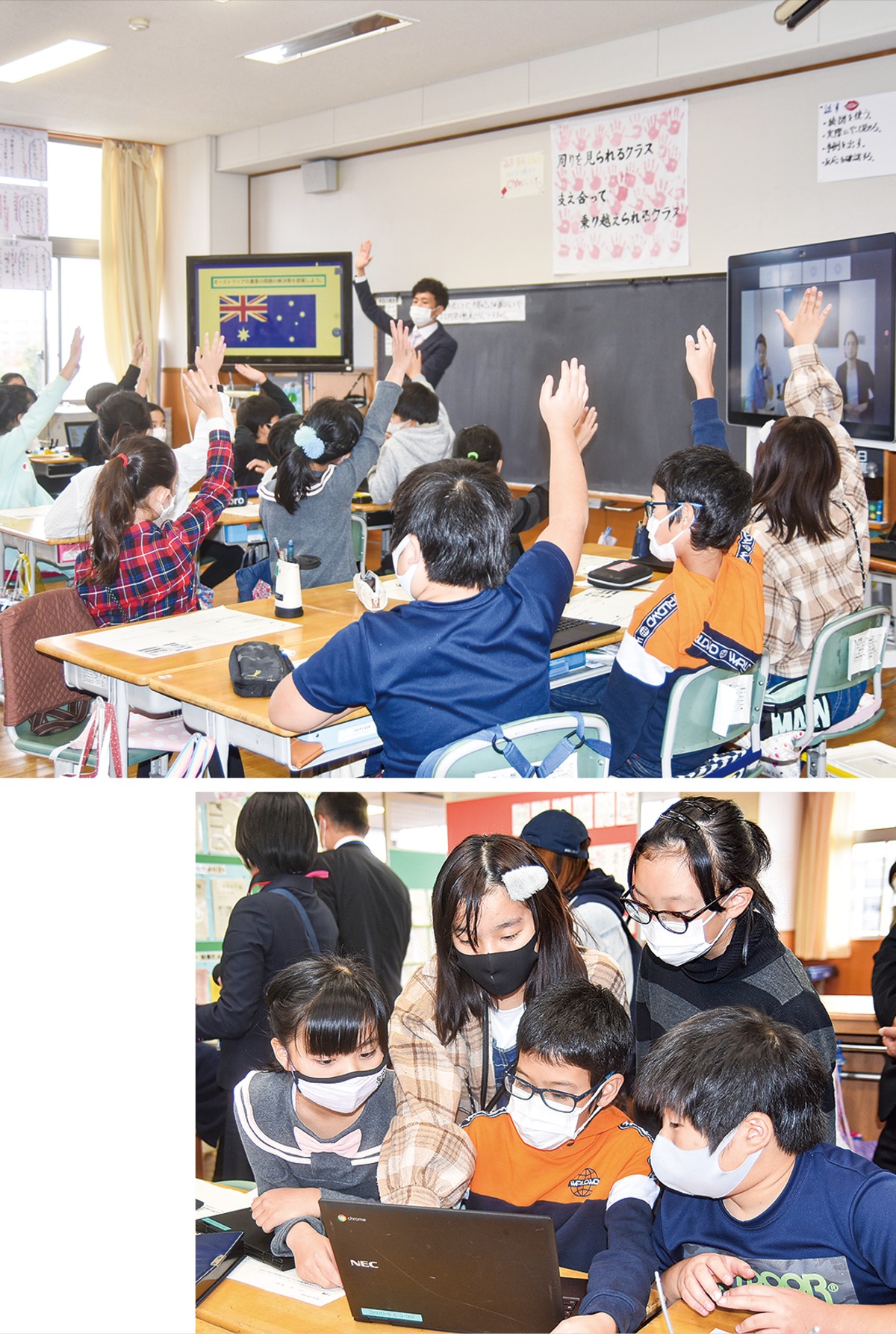小山小学校の5年生は総合的な学習の時間に、干ばつ地域であるオーストラリアの農業の問題を解決する機械として「灌水機」をプログラミングで制作し実際に現地に送付したが、そのモデルのプログラムに不具合があることが発覚。児童たちはモニターを通して現地のスタッフと英語でコミュニケーションを取りながら、不具合になってしまったプログラミングの手直しを行った。グループごとに分かれ、意見や情報を交換し合いながら最終的にバグの修正に成功し、プログラミング通りに機械が動くと児童からは拍手と歓声が上がった。