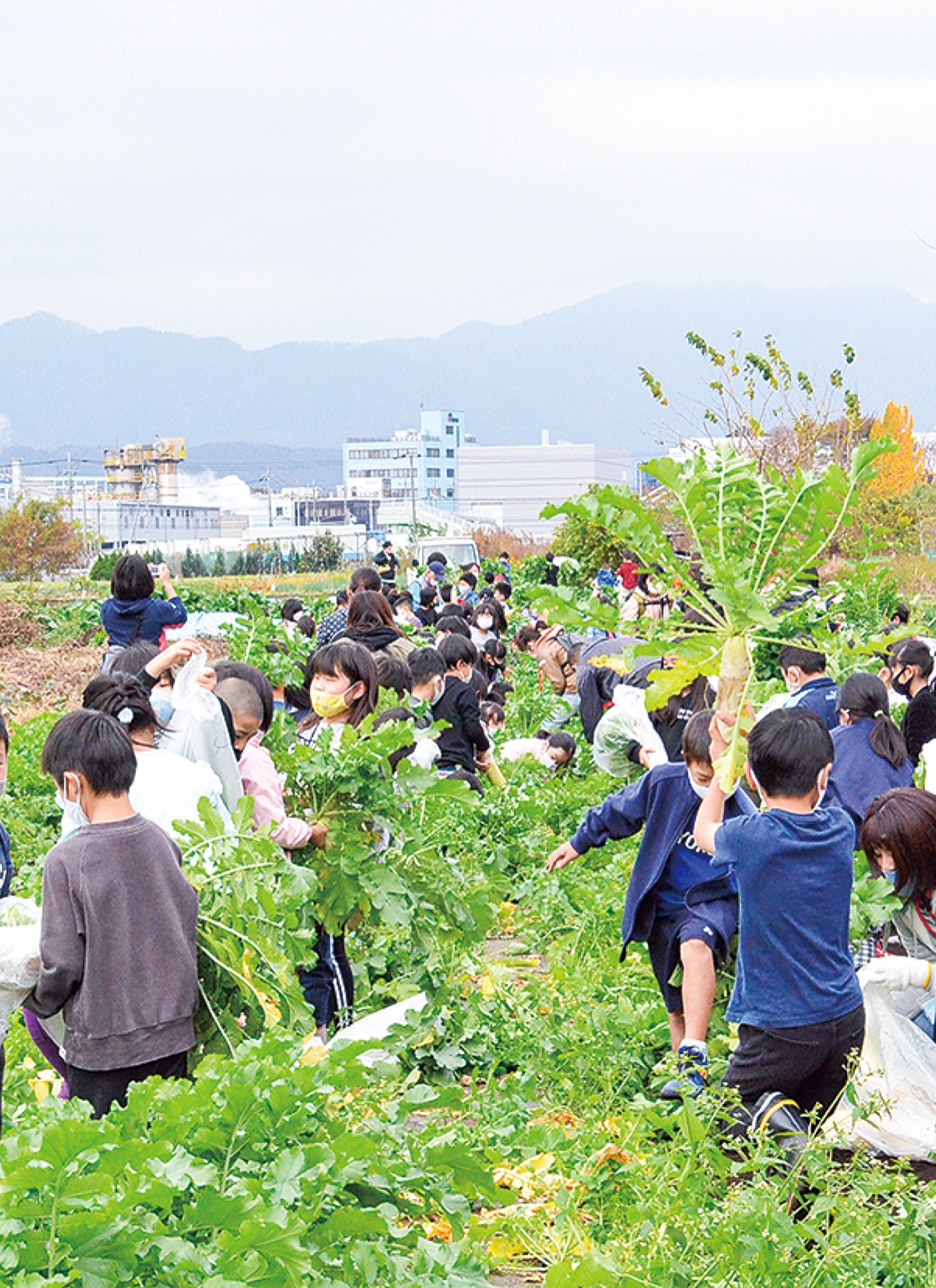 種まきと収穫に協力したのは、地元の番諏農友会のメンバーら。同会の森川清志さんが「みんなの大根、こんなに大きく育ったよ」と採れたての大根を手に語りかけると「おぉー」と、歓声が沸いた。各自2本ずつ収穫し、1本は学校給食用に、1本は家へ持ち帰った。初めての収穫を終えた児童からは「丸太運んでいるみたい」「おでんで食べたい」「皮をきんぴらにしたい」など、元気な声が聞かれた。