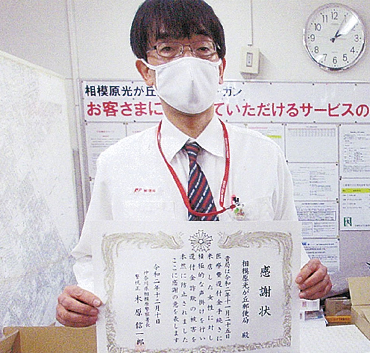 相模原光が丘郵便局局員の佐藤敏男さんに対し10日、同局内で、平野洋一生活安全担当次長から感謝状が贈られた。