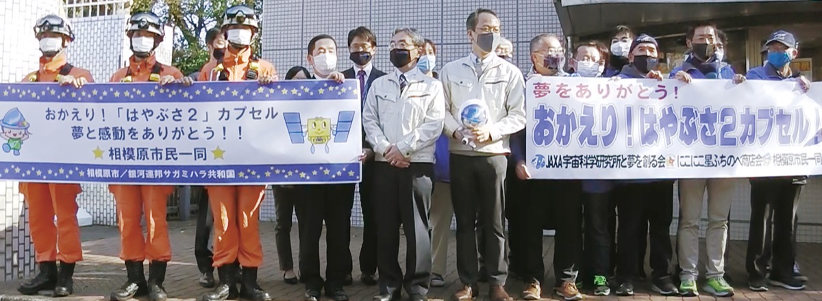 小惑星探査機はやぶさ2から6日未明に地球への帰還を果たし、オーストラリアのウーメラ砂漠で回収されたカプセルがJAXA宇宙科学研究所に到着した8日、施設の正門前には市職員のほか、地元商店街関係者が出迎え、「故郷」への無事の帰還を喜んだ。