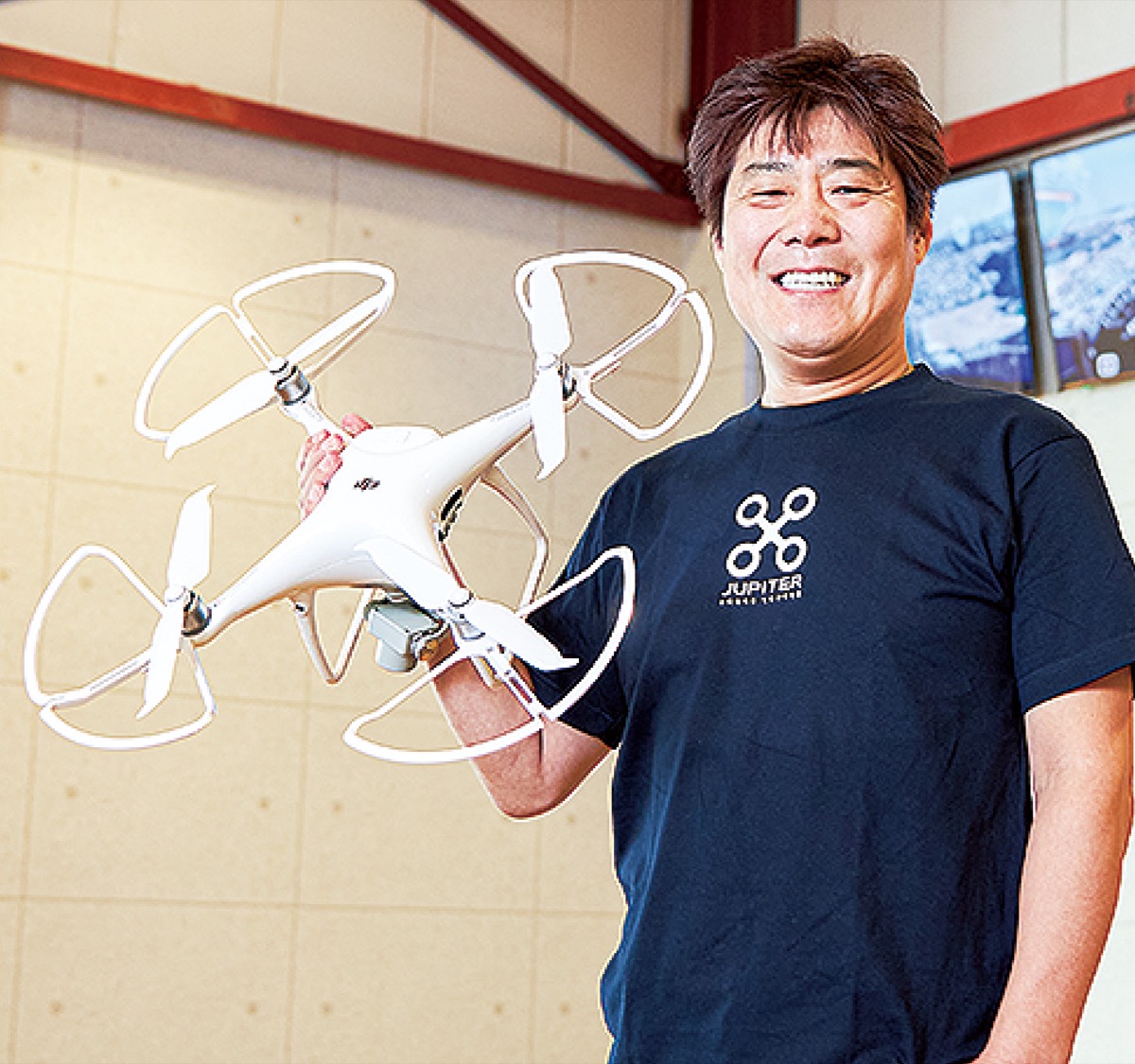 昨年秋、横山に誕生した「ドローンラウンジ・ジュピター」。運営する(株)グローバル・ウノの川合靖一代表は、「生まれ育った相模原のまちに貢献したい」と、災害支援も視野に入れ、ドローンをはじめとするマルチコプター事業を始めた。「まだスタート地点。今年は飛躍の年にしたい」