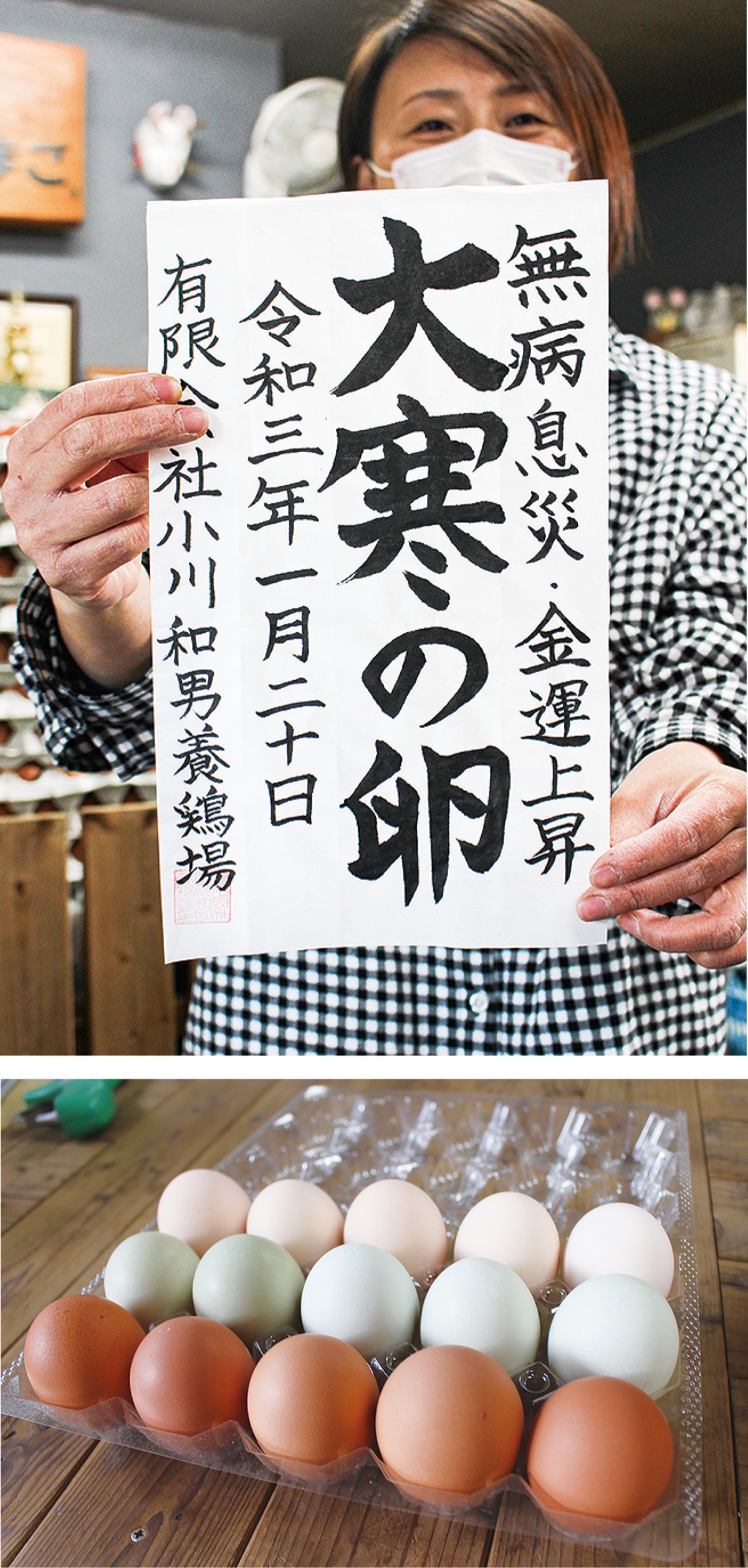 3種類のタマゴを取り扱う田名の養鶏農家、小川和男さんのところでは毎年、この日に生まれたタマゴは「身体に良い」とされることから、無病息災などのメッセージと共に「大寒の卵」と記したラベルを商品と一緒に梱包するのだという。「お客さんの健康を祈りながら梱包しています。プレゼントするものとして予約される方が多いですね」と小川さん。なぜ、この日に生まれたタマゴが一番おいしいのかという問いに対しては、「ニワトリは気温が低い方が元気で餌をよく食べるようになるから、より栄養のあるおいしいタマゴを生むようになるのではないかな」と笑顔をみせる。