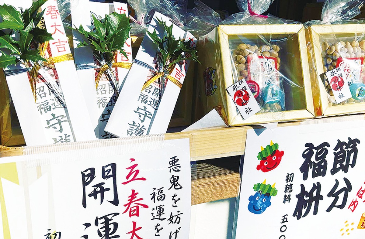 清新の氷川神社では、節分に合わせ、「悪鬼を妨げ福運を招き入れる」とする、「立春大吉開運招福神日札」と「福豆」を用意している。神礼には境内で育ったひいらぎを添えて邪気をはらい、開運招福を祈願した。浅原寛宮司は「おはらいしたお豆については数量限定でお渡しいたします」と話している。