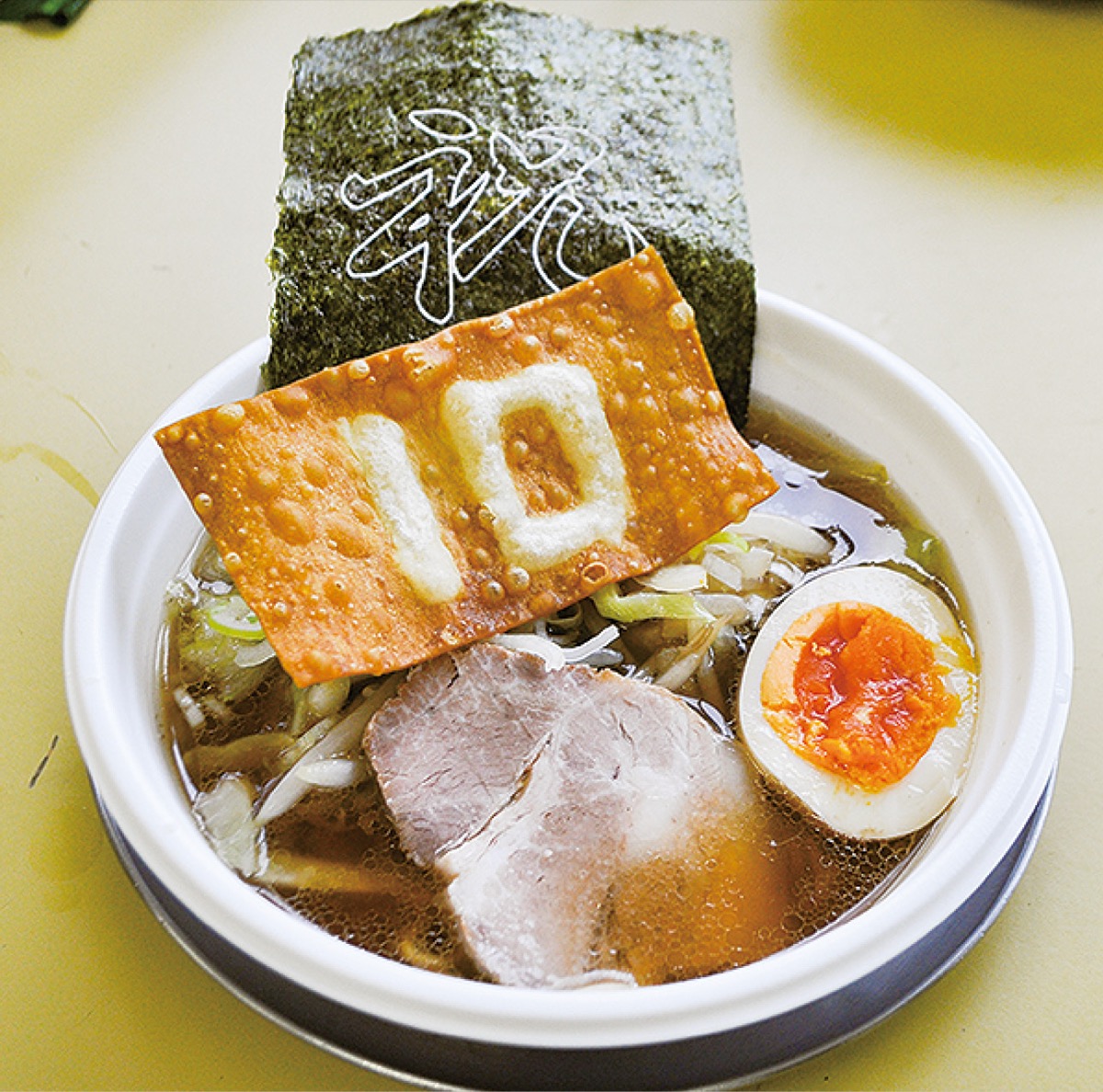 メニューの中でこだわったのが地場産の食材を使うこと。メニューに沿って素材などを選んで調理したのは、地元中華料理店「昌龍飯店」の河内文雄さん。チャーシューに相模原ブランド豚「香福豚」を使用、卵は南区麻溝台のたまご街道にある養鶏場の卵を使い、小松菜も地場産にこだわった。河内さんはこれらに、「祝」と書かれた海苔や「10」をあしらったワンタンを作り、よりメニューに近づけた。名称は「南区10(テン)こもりラーメン」に決まった。