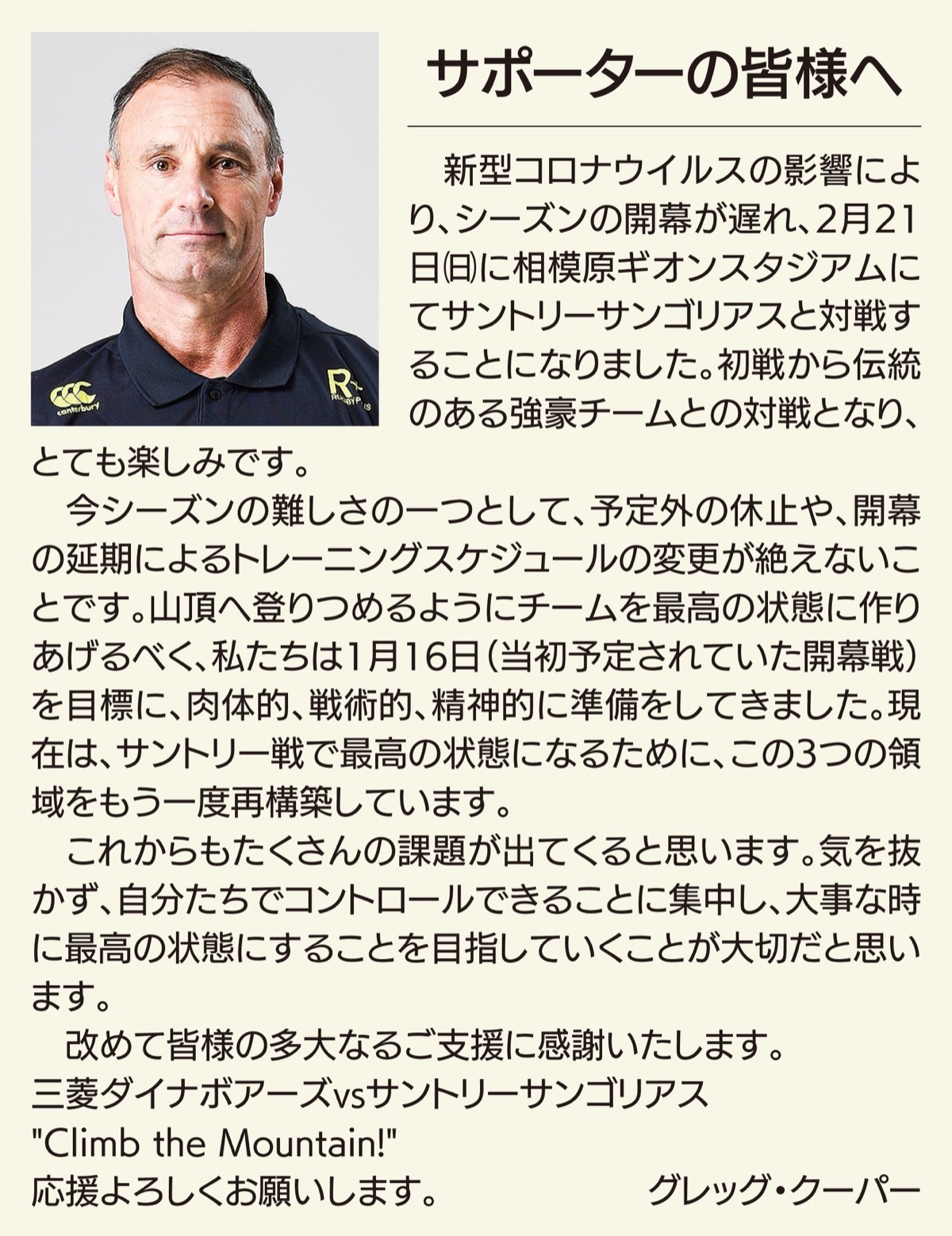 開幕を前にグレッグ・クーパーHCは「今季はさまざまな困難がありましたが、チーム全員で乗り越えてきました。今季は『世界で最も困難で過酷な山』への登頂に例え”CLIMB THE MOUNTAIN”『登りきる』をテーマとしました。目標を達成するための準備、周りの人たちへの信頼、そして目標を達成するための勇気が必要とされます。チーム全員で目標を達成したい。まずはシーズンが開幕されることに感謝し、応援してくださる相模原の皆様とともに全力で戦います」とコメント。土佐、トーマス両主将は「いよいよトップリーグが開幕します。開幕戦を地元相模原ギオンスタジアムで行えることを心からうれしく思っています。一度は延期になってしまいましたが、チームはすぐに気持ちを切り替えしっかりと準備を進めてきました。初戦のサントリーは、例年トップリーグ上位となっている強豪チームであり挑戦者としてすべてをぶつけることができることがとても楽しみです。皆様の応援が私たちの力になりますので、温かいご声援をよろしくお願いします」と意気込みを述べた。