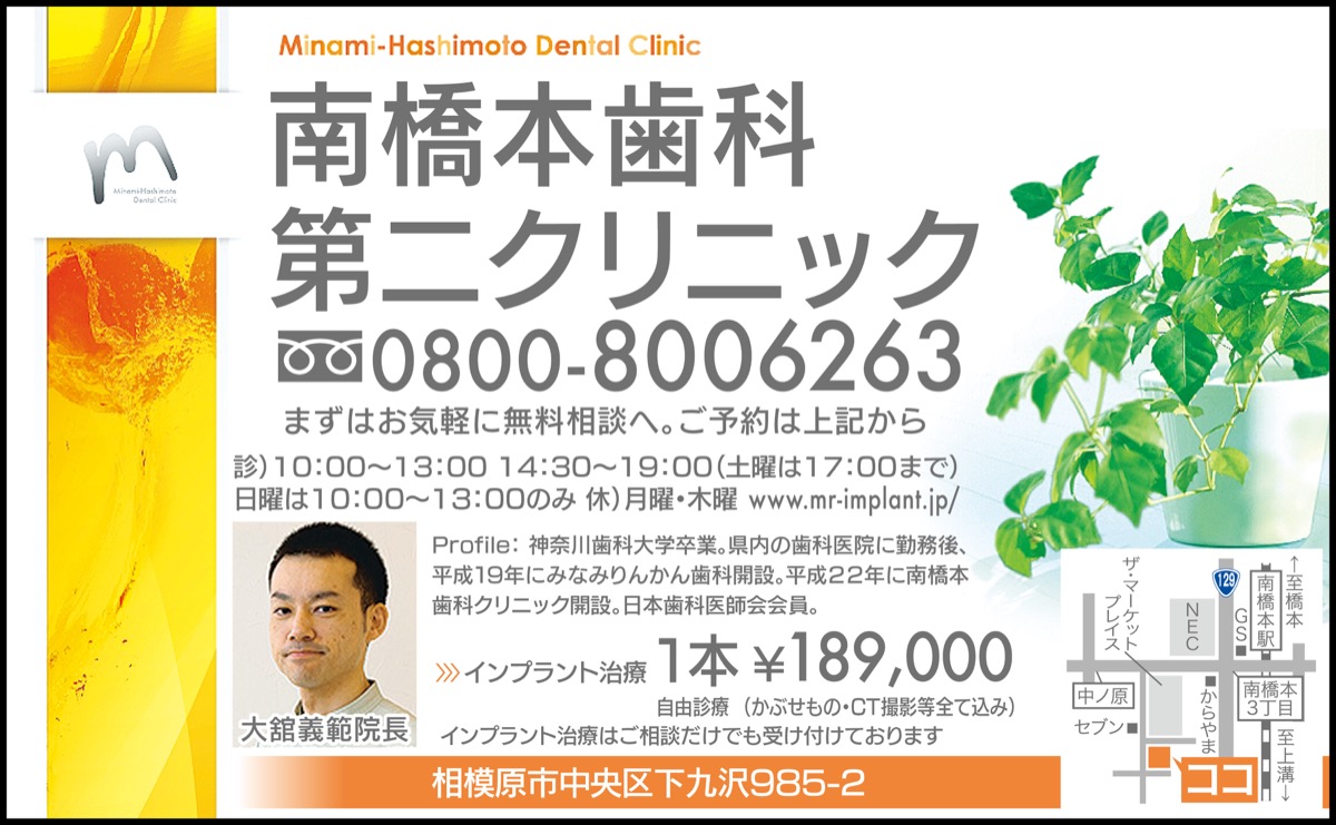同院では、1本18万9千円でインプラント治療を実施。さらに10年の保証期間付き。この保証期間内にインプラントが欠けたり、抜けたりしても無料で再治療が受けられる。大舘院長は「他院で治療を断られた方もご相談下さい」と話す。