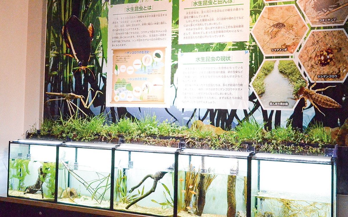 「水生昆虫」とは、一生または一時期を水中や水面で生活する昆虫のこと。主に河川や地沼など植生の豊かな湿地に生息するが、近年では河川の改修や宅地造成を理由にその多くが消失しつつある。昆虫たちは湿地を求めて、水田や水路を拠り所にしているという。新展示では、自然における水田の役割を伝えつつ、水の中という特殊な環境に棲む水生昆虫のユニークな生態をボードなどでわかりやすく紹介。既に神奈川県の自然界では見られなくなったゲンゴロウやタガメなども間近で見ることができる。