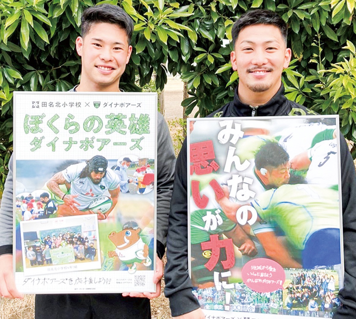 制作に当たってはチームの広報担当のほか、地元の印刷会社が協力。ビデオ会議アプリを使って何度も検討を重ね、写真の選定やキャッチコピーに至るまで児童のアイデアを盛り込んだ。1組は「ぼくらの英雄ダイナボアーズ」と掲げ、選手と交流する児童の写真をあしらった。2組は「みんなの思いが力に!」と強調。激しくタックルする選手の写真が特徴的なポスターを完成させた。