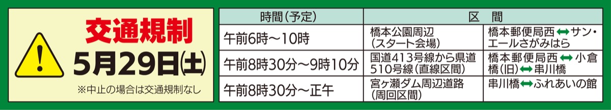 29日に行われる相模原ステージでは、橋本公園(緑区)の西側を午前8時50分にスタート。国道413号の相原台交差点から旧小倉橋を経由し(旧小倉橋まではパレード区間)、串川橋交差点へと続くオリンピックでも使用されるコースを直線区間として走行する。串川橋交差点からは周回区間となり、左折して国道412号沿いに時計回りで宮ヶ瀬ダム入口を右折し、北岸林道から鳥居原ふれあいの館の前を通り、鳥屋から関交差点を経由して串川橋交差点に戻るコースを7周半走行する。起伏に富んだ難関のコースを周回した後、ゴール地点の鳥居原ふれあいの館には正午頃に到着する予定。開催にあたりコースや周辺道路では大規模な交通規制が実施される。詳細は市ホームページから確認できる。
