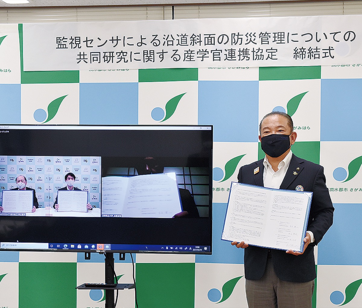 相模原市は5月、商業施設などの開発業務を行うザイマックス不動産総合研究所と兵庫県立大学社会情報科学部との間で、「監視センサによる沿道斜面の防災管理についての共同研究に関する産学官連携協定」を締結した。