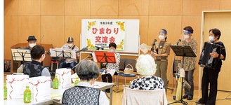 当日は除菌、検温、マスク着用、換気など感染症予防を徹底し、同社協から招待を受けた約20人が参加。同社協の長谷川澄男会長は「コロナ禍でも交流会を開催できてよかった。短い時間だが、楽しんでいただきたい」と期待を寄せた。会が始まると市内で活動する「とことん懐メロ歌謡楽団」が演奏を担当し、昭和の名曲を披露。『青い山脈』、『リンゴの唄』、市に所縁のある菅原都々子さんの『月がとっても青いから』などの曲を生演奏に合わせて、参加者は楽し気に歌っていた。終了後には「久しぶりに声を出して歌えてうれしかった。皆が知っている曲で懐かしい」「歌っている最中に思わず涙が出た」などの感想が挙がった。