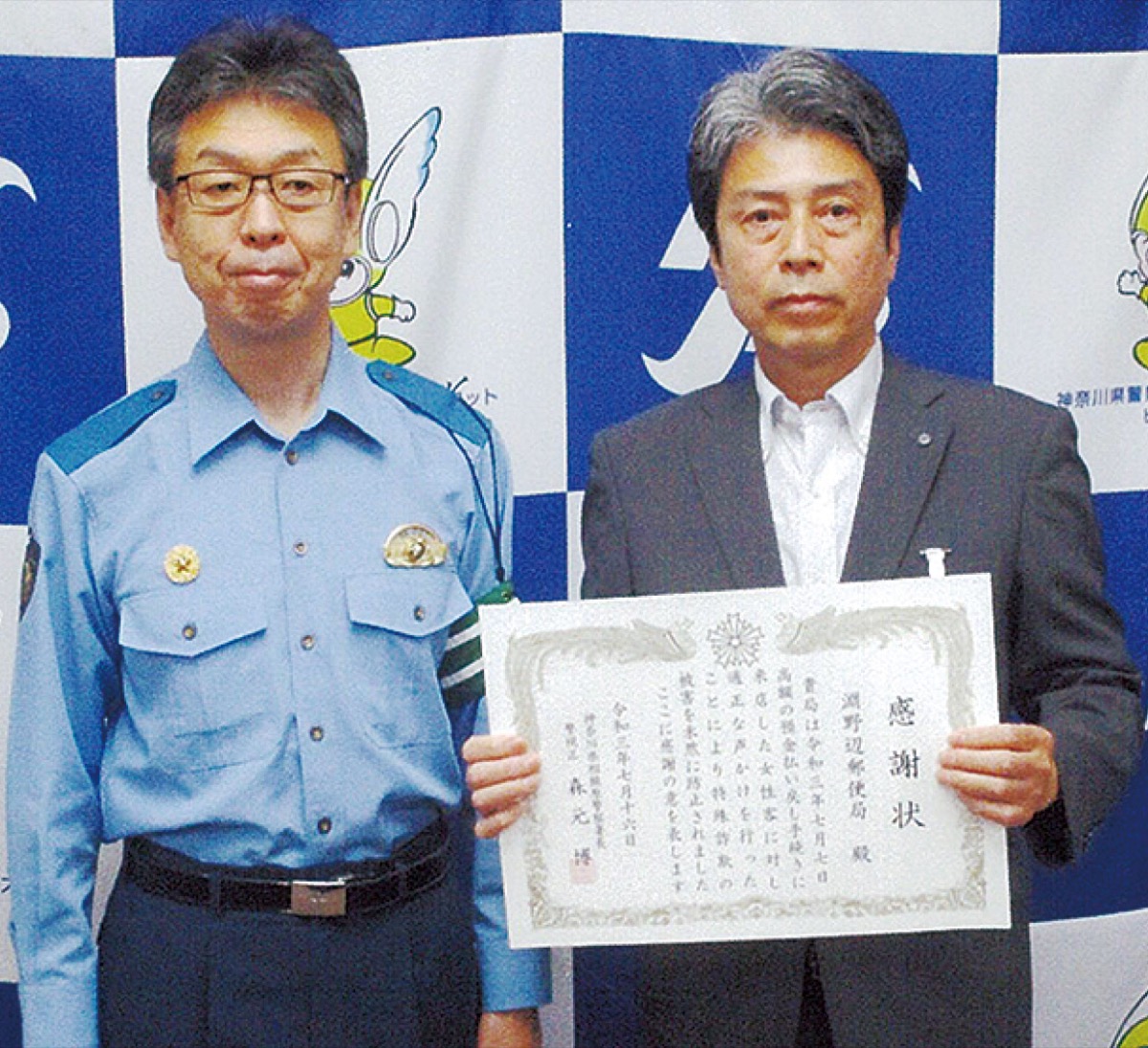 特殊詐欺の被害を未然に防いだとして相模原警察署(森元博署長)は7月16日、淵野辺郵便局(細野浩保局長)に感謝状を贈呈した。