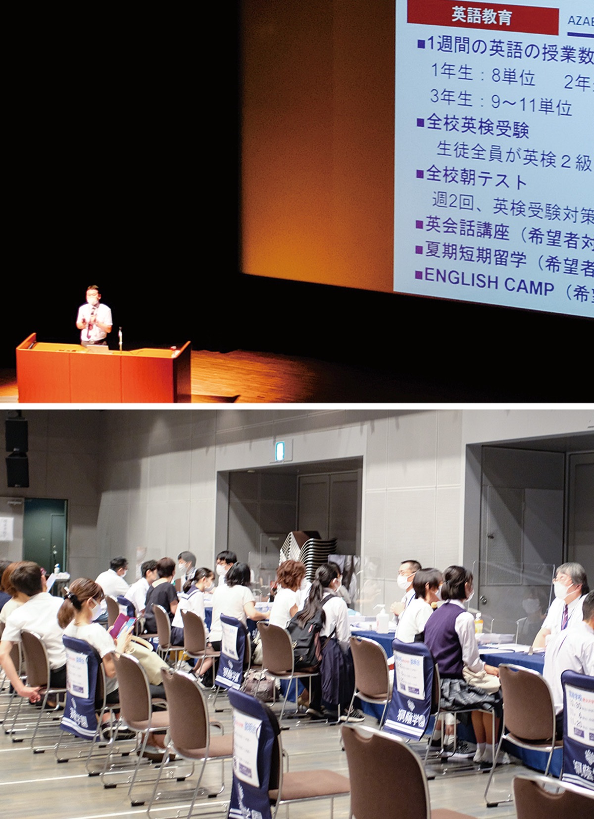 淵野辺の麻布大学附属高校は8月19日、相模女子大学グリーンホールで桜美林高校(町田市)および桐蔭学園(横浜市青葉区)と「私立3高等学校合同説明会・相談会」を開催した(相模原市教育委員会後援)。ウイルス感染に配慮しホール定員の半数以下に人数制限して行われた同会には、来年受験を控えた中学3年生やその保護者ら約1700人が参加した。