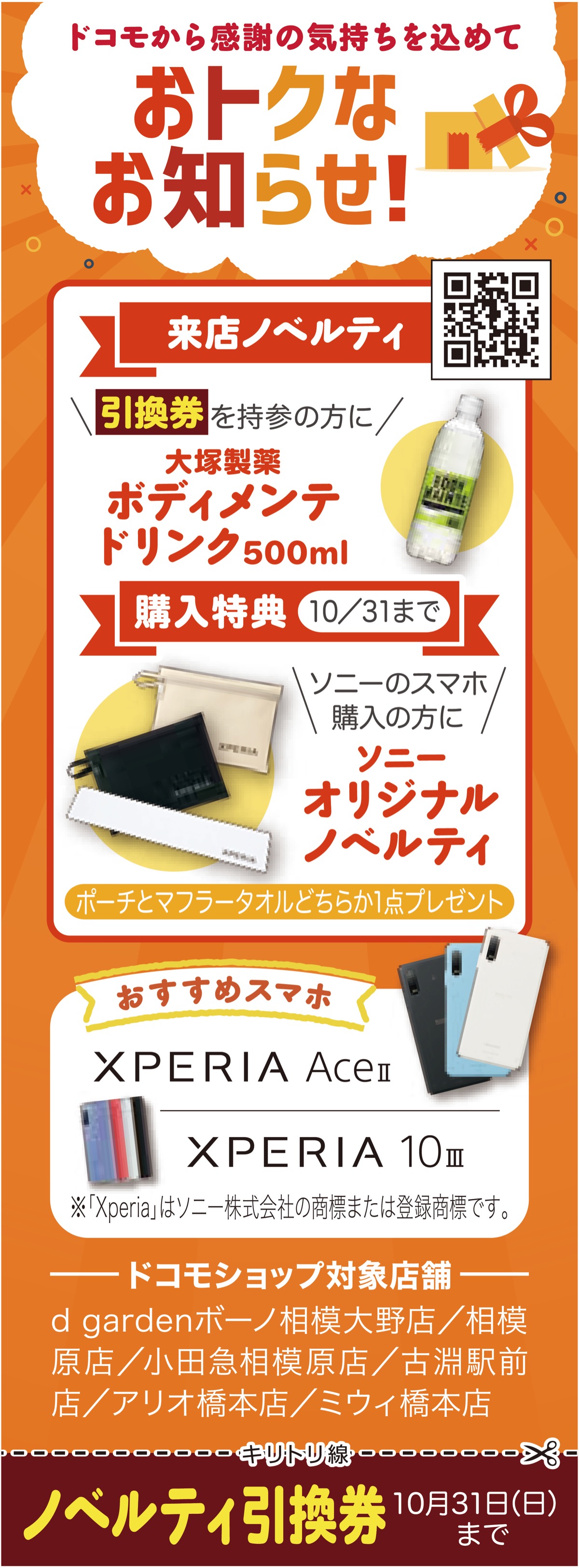 NTTドコモでは、長年利用しているシニアユーザーへ日ごろの感謝を込めて10月31日(日)までソニーの新作機種の購入で素敵なポーチかマフラータオルのどちらか1点をプレゼント中。シンプルな機能に劣化しにくいバッテリーを搭載したエクスペリアAceIIと、写真や音楽がたっぷり楽しめる10IIIの今、おすすめの2機種が対象。また期間中は来店すると乳酸菌で体調管理をサポートするボディメンテドリンク(500ml1本)もプレゼント。