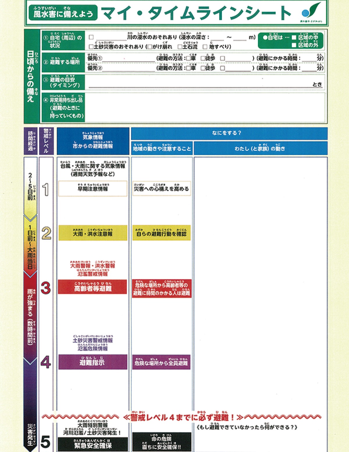 マイ・タイムラインとは、住民一人一人が自宅周辺の環境や自身の家族構成を踏まえた上で、台風などによる河川水位の上昇などの緊急時にどのように行動するのかを時系列で整理し、まとめた行動計画表。市内各地域でも積極的に普及活動が行われており、自治会に向けた講習会や小学校での作成体験授業などに市職員が赴き、指導にあたっている。