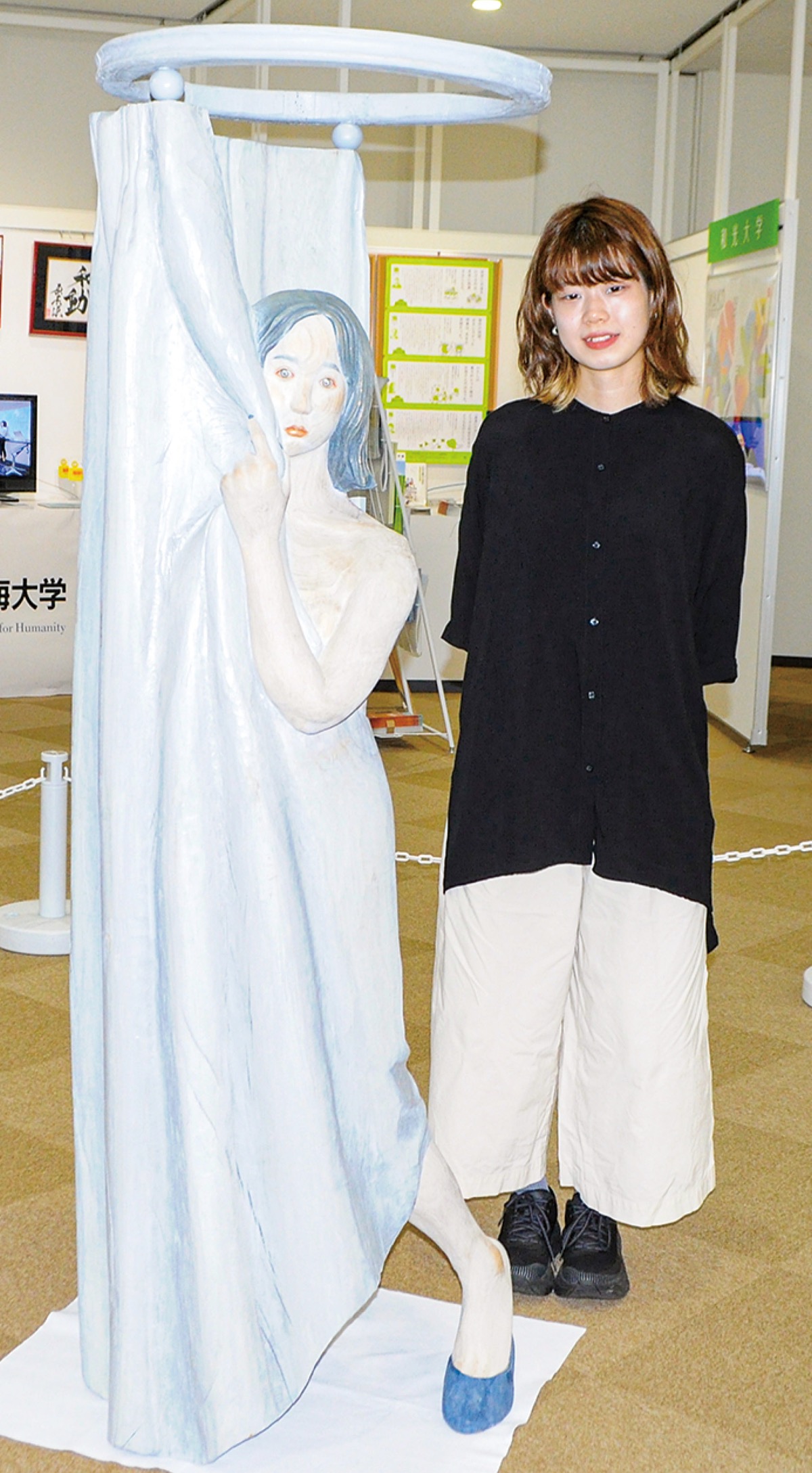 ユニコムプラザさがみはら(南区)の受付前にある展示場所に、女子美術大学大学院2年の増井萌さんが制作した木彫の女性像「objective room」が展示された。増井さんは「彫刻を見る機会は少ないと思うので、多くの方に見てほしい」と話している。