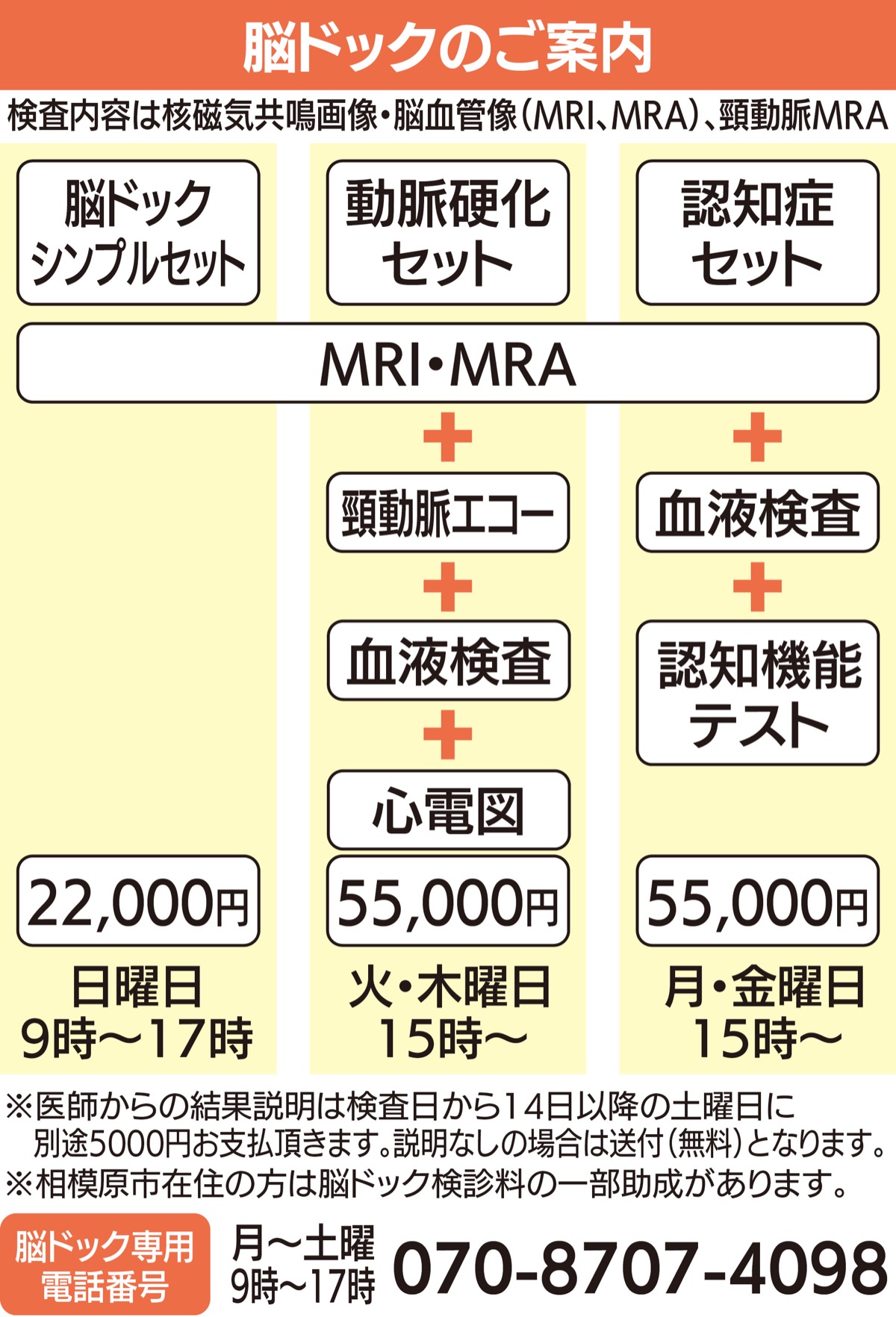 検査内容は核磁気共鳴画像・脳血管像(MRI、MRA)、頸動脈MRA。後日、報告書およびMRI・MRA画像を郵送。健康保険の適用外。国民健康保険では検診料の一部が助成される。同院では「詳細についてはお問い合わせください」としている。